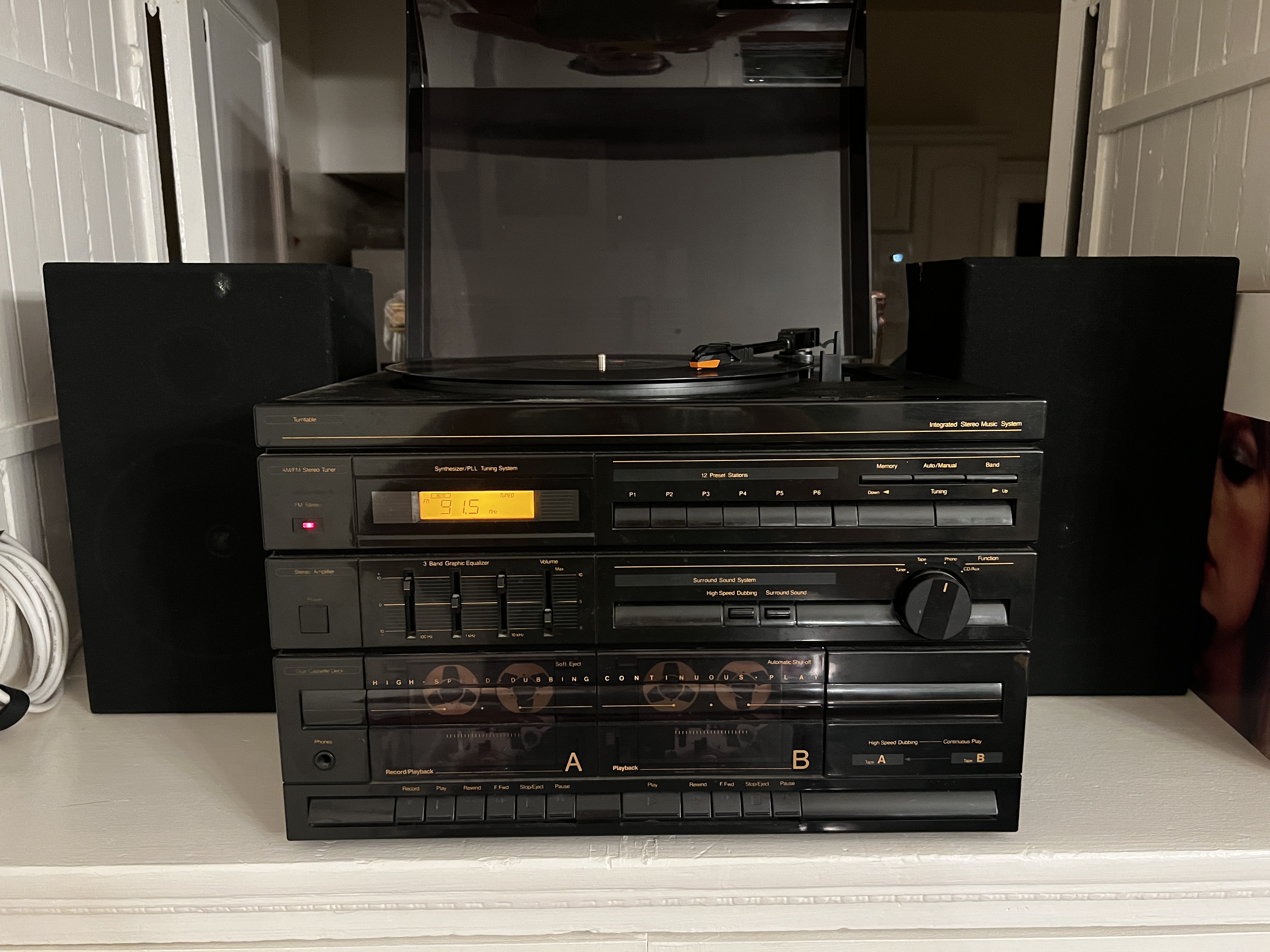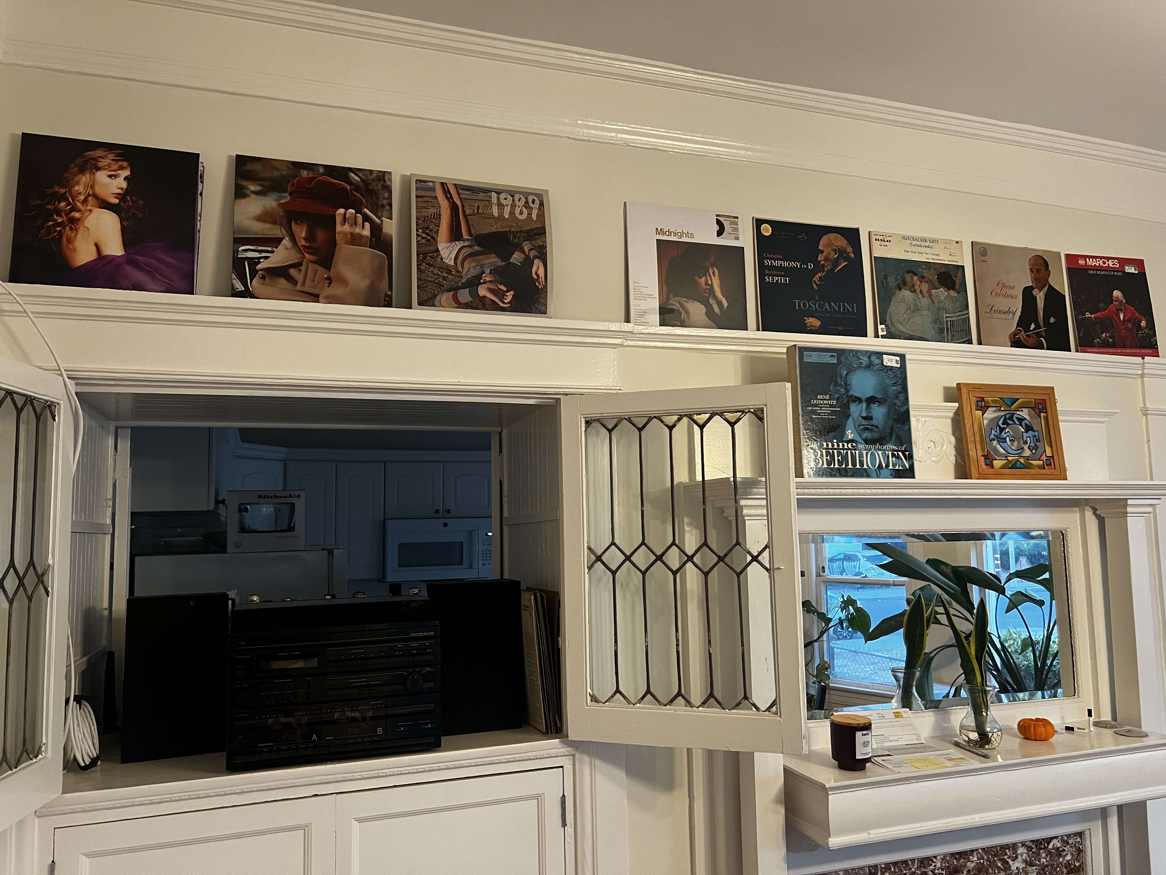 Around them, the room is lined with records, each carefully selected from thrift shops and flea markets, whatever they can get their hands on for cheap, and placed attentively along the fringes of the room's crown molding. Everything from vintage jazz recordings, classical symphonies, country music, and even some Taylor Swift can be found.