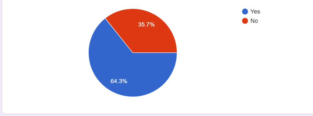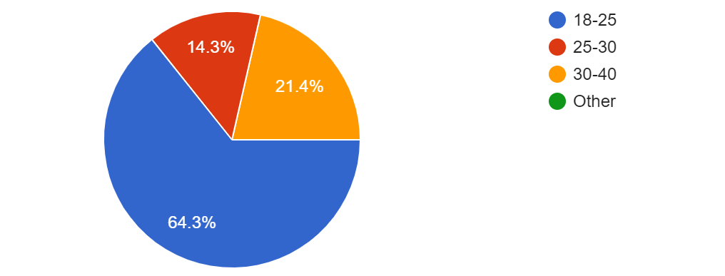 Most of the individuals that provided responses were between 18-25 which was 64.3% of the total answers. A 14.3% ranged from the ages between 25 and 30 while the 21.4% were between the ages of 30 and 40