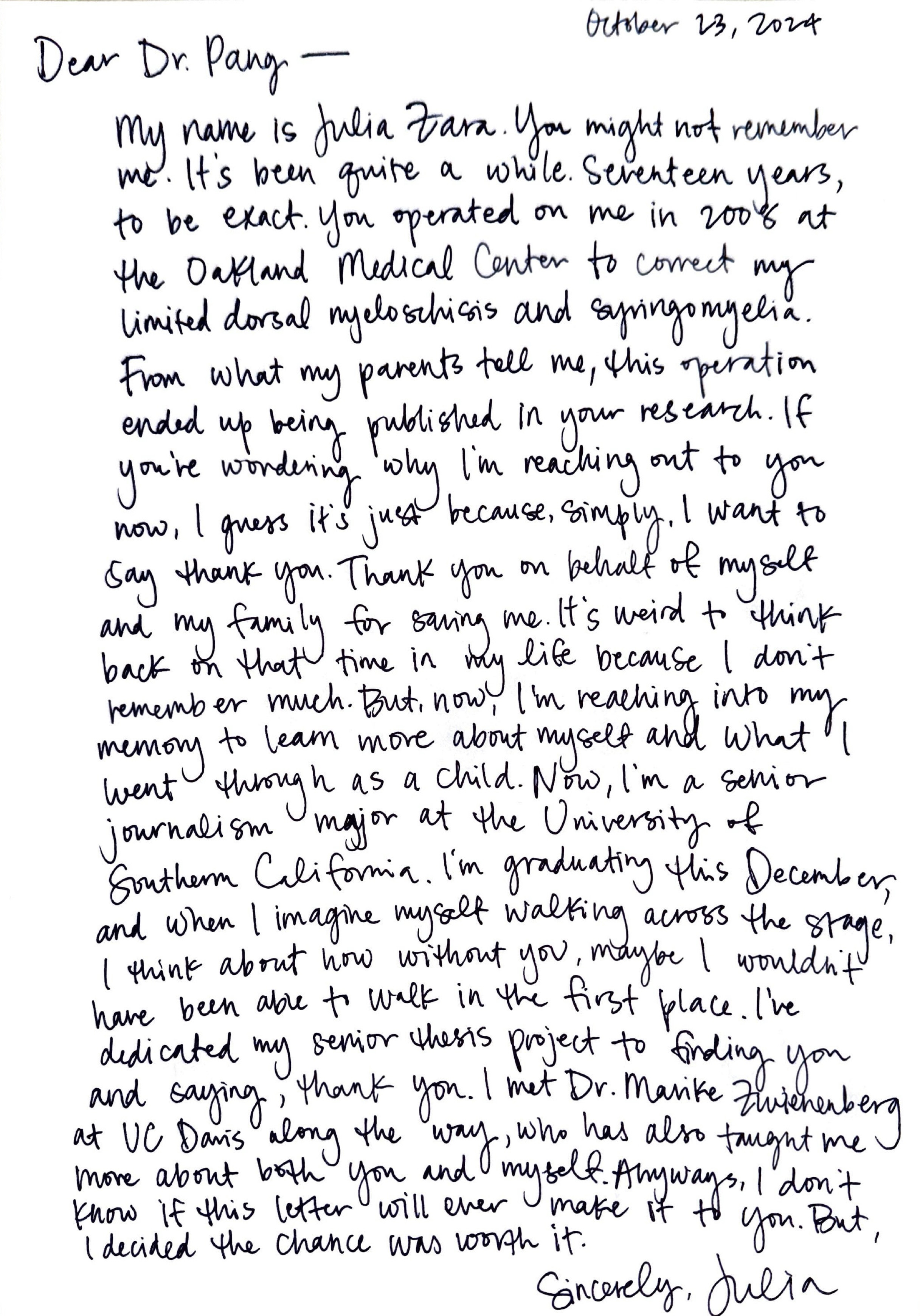 After a Google search and a call to the Oakland Medical Center (where I had my surgery) I confirmed that my doctor had been the chief of pediatric neurosurgery at the University of California, Davis. I emailed the UC Davis pediatric neurosurgery department, and a member said that Dr. Marike Zwienenberg would be my best bet at finding him. So, I gave her a call.