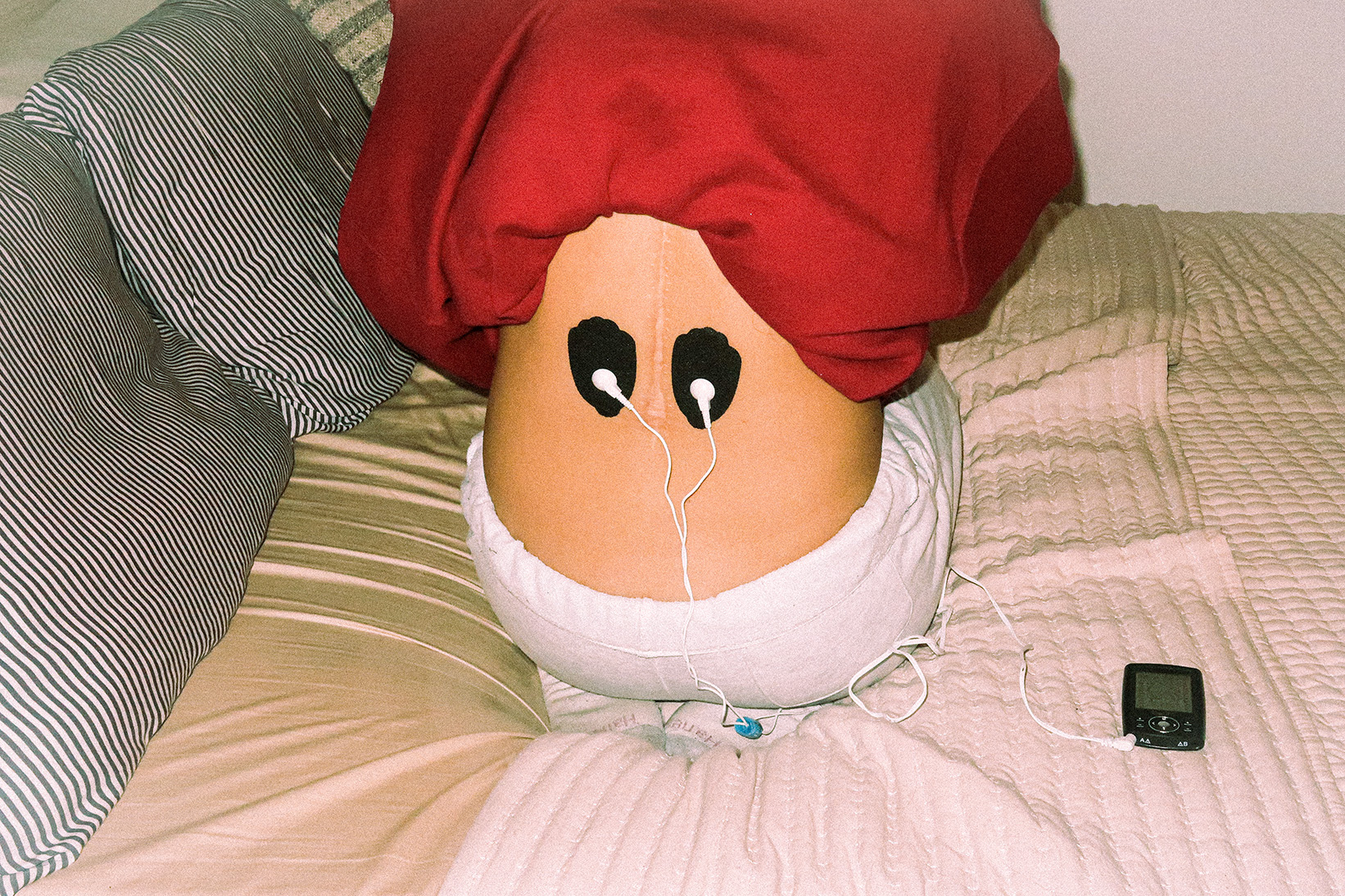 Twice a day, I use a TENS (transcutaneous electrical nerve stimulation) machine on my back. It delivers a low electrical current, stimulating my nerves and relieving pain.