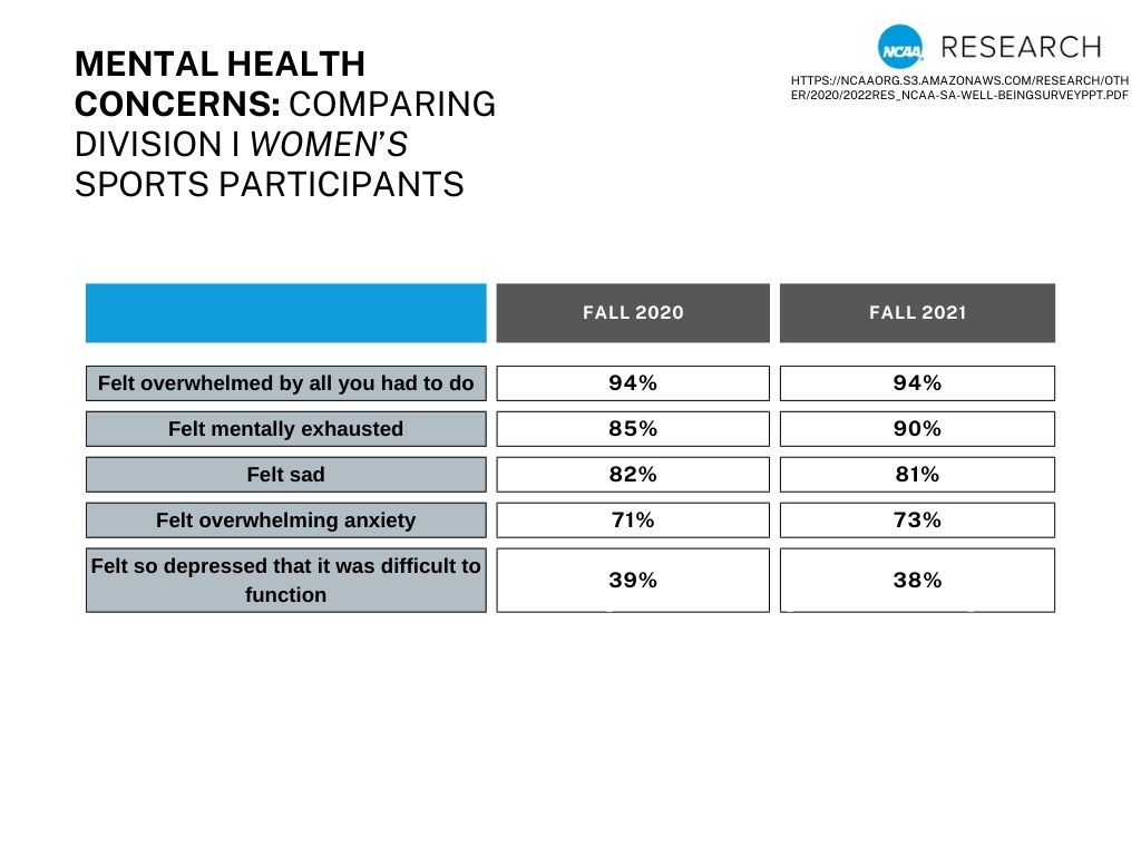 She states that the most vulnerable age range around mental health systems is in the 18 to 24 year old range. And this is not unique to just student-athletes, this is across the board in the country where anxiety and depression becomes apparent.