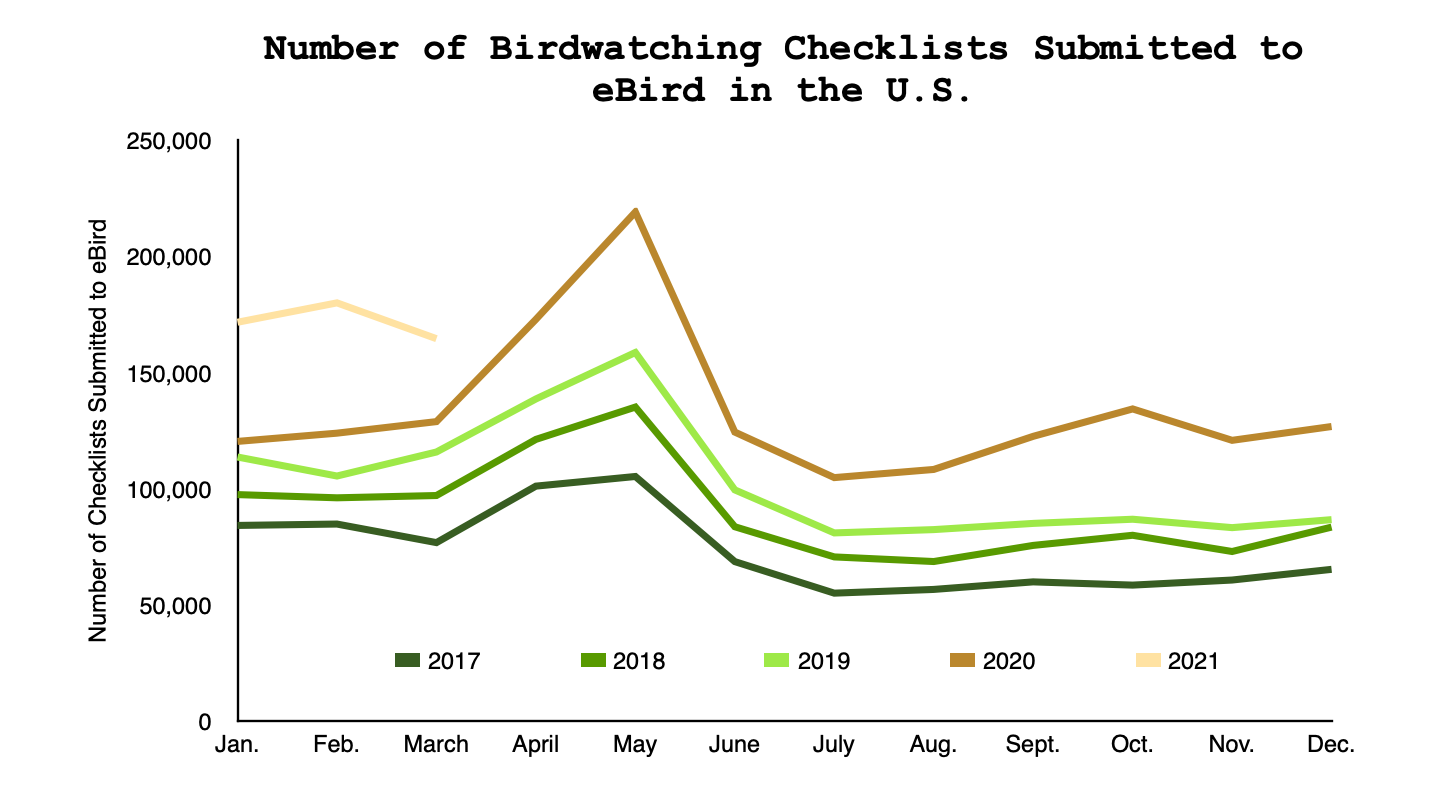 It seems that people took note of the improved bird activity during the pandemic too. An American birdwatching database, eBird, saw an increase of bird checklists submitted to the site since April of last year.