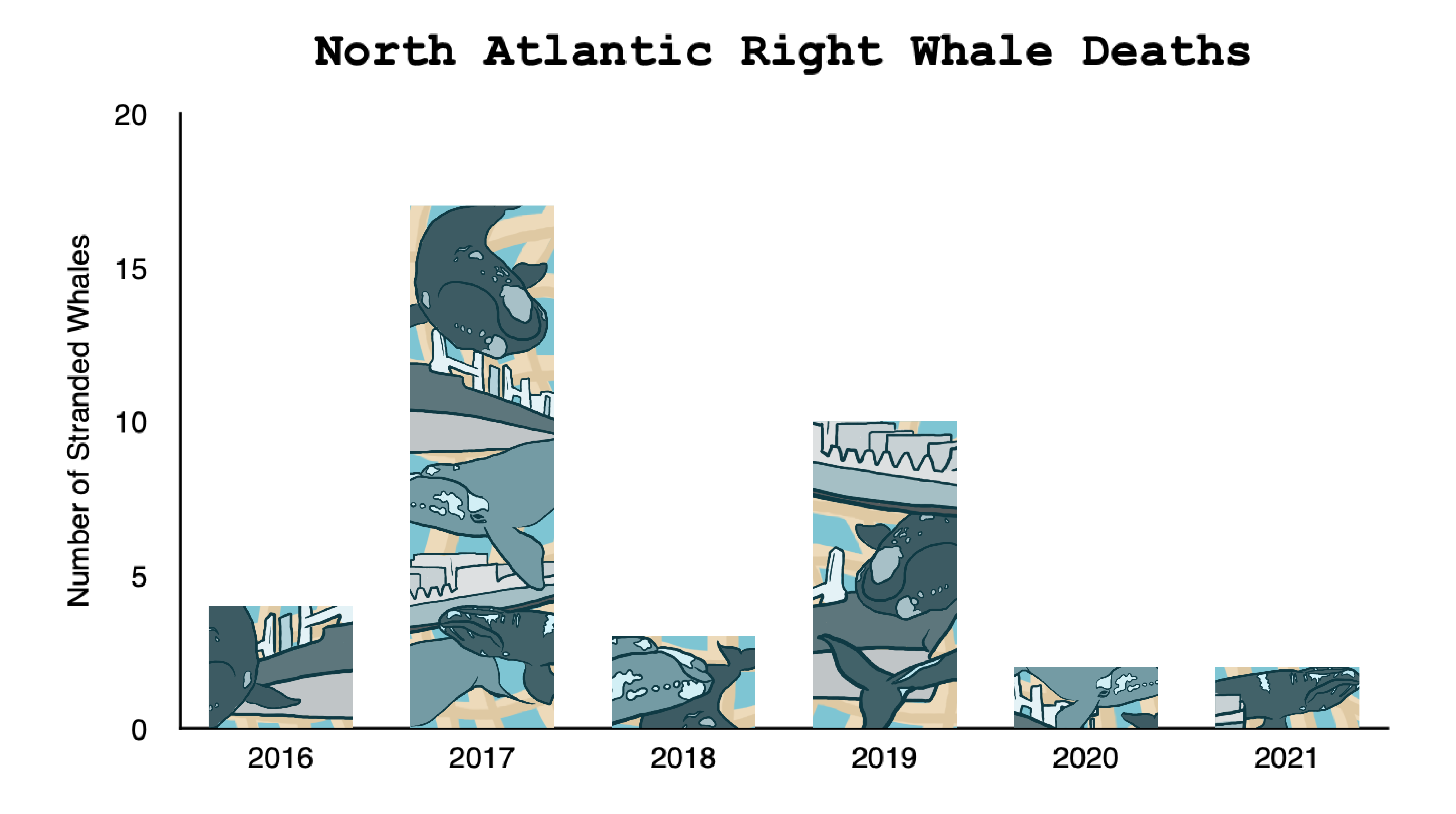 Reduced shipping during the pandemic may have affected the lower number of confirmed Right Whale deaths in the past year. According to the National Oceanic and Atmospheric Administration (NOAA), in 2019, there were 10 confirmed Right Whale deaths in American and Canadian waters. In 2020, there were just two confirmed deaths. The first three months of 2021 also saw just two reports. At least half of these deaths each year were due to human causes.