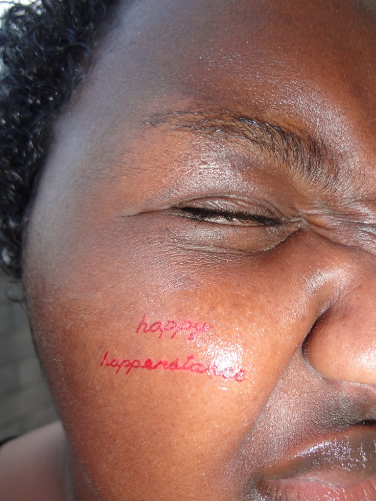 Adorning Jama’s right cheek are now the words “happy happenstance” in curly red ink.