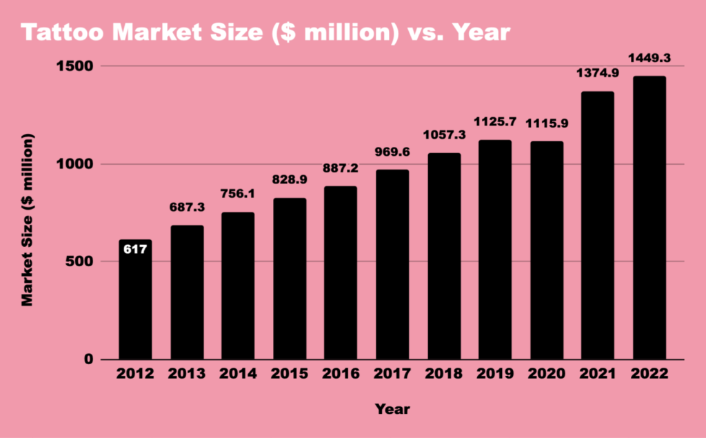 According to IBISWorld analysts, the market size of the tattoo artist industry in the United States grew from $1115.9 million to $1449.3 million from just 2020 to 2022. The market size of the tattoo artists industry in the United States has grown 8.4%, on average, between 2017 and 2022.