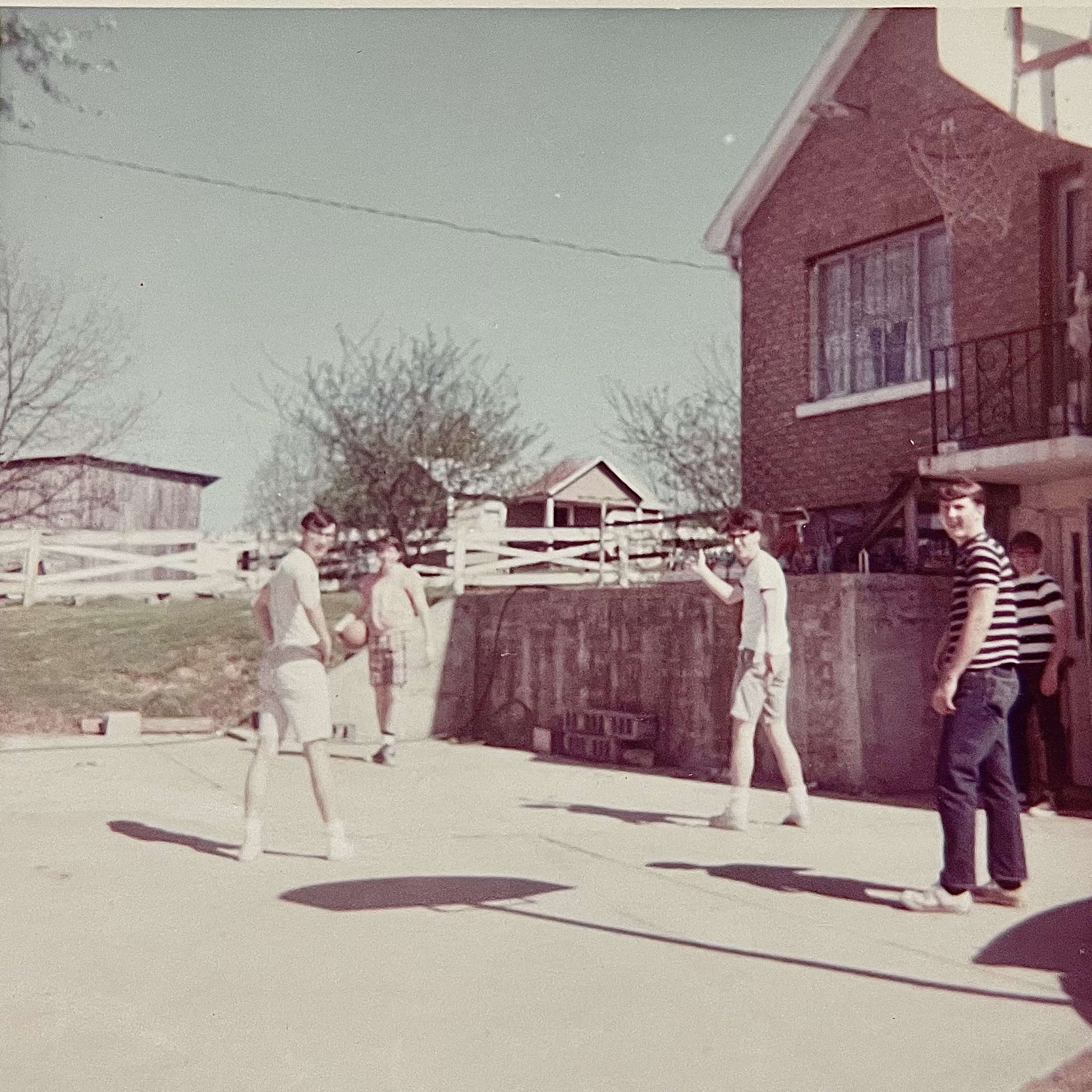 Danny and friends shooting ball outside the basement he would sneak out of.