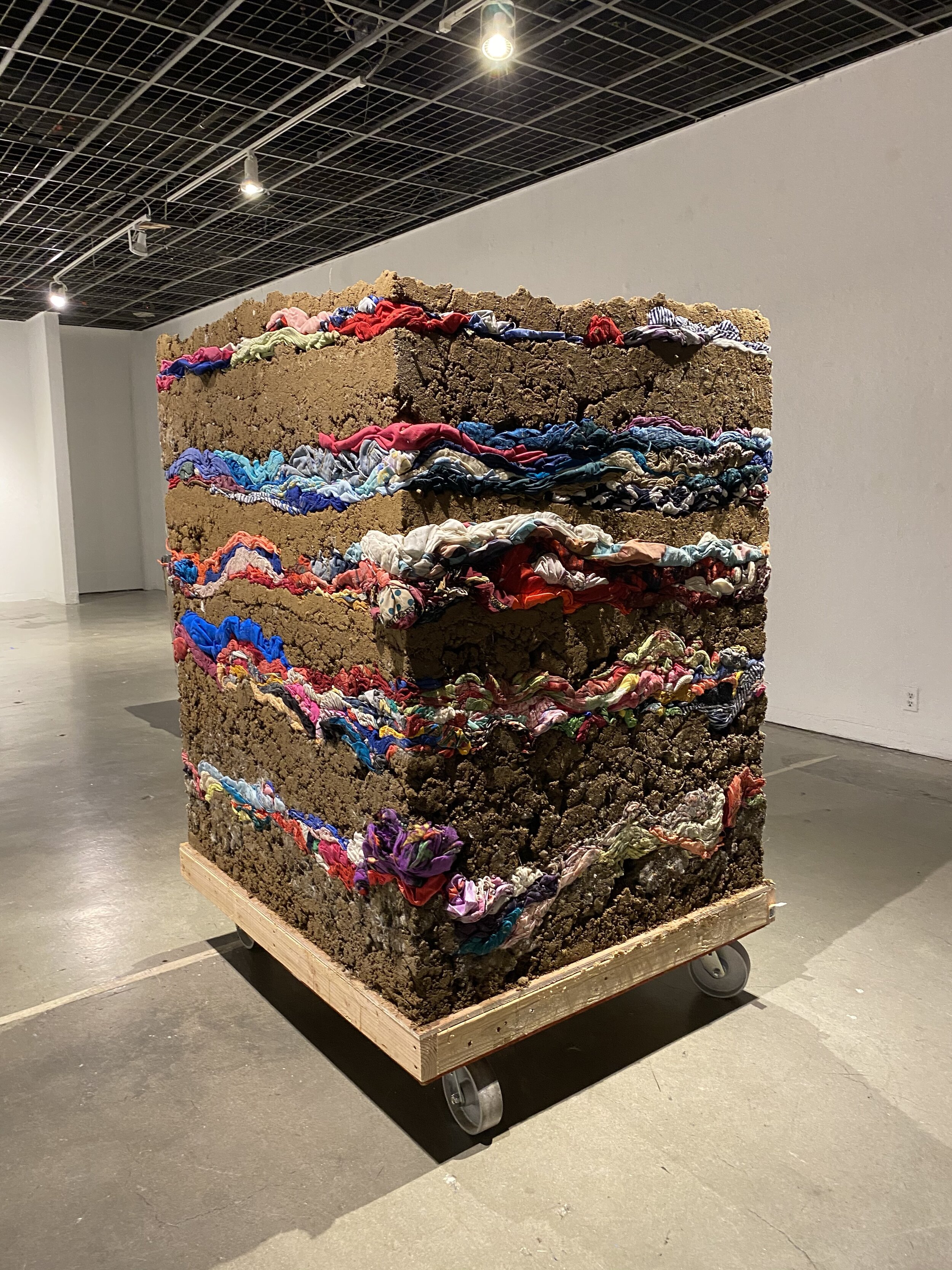 Core Sample (2020) is a sculpture inspired by the Atacama desert made of layers of recycled clothing, wood, and mud.