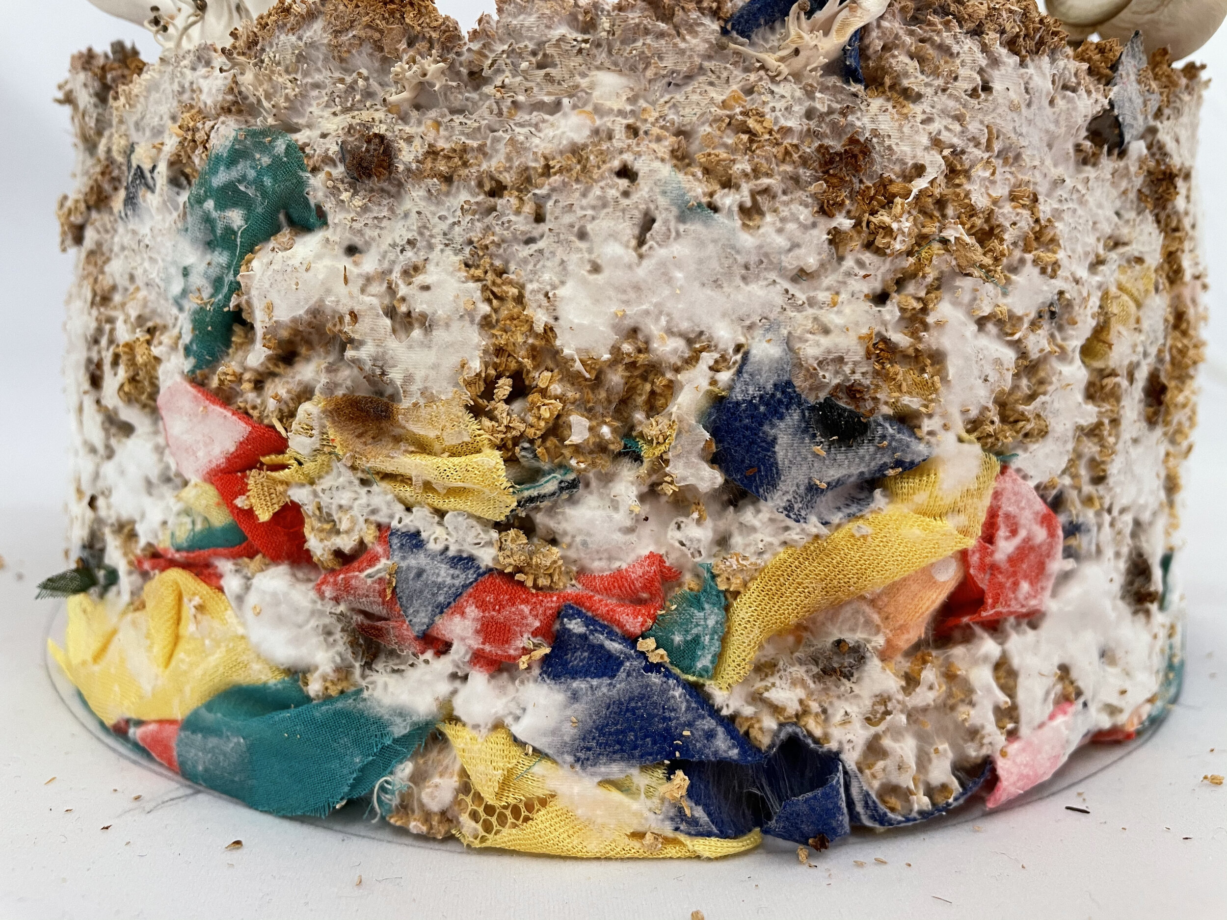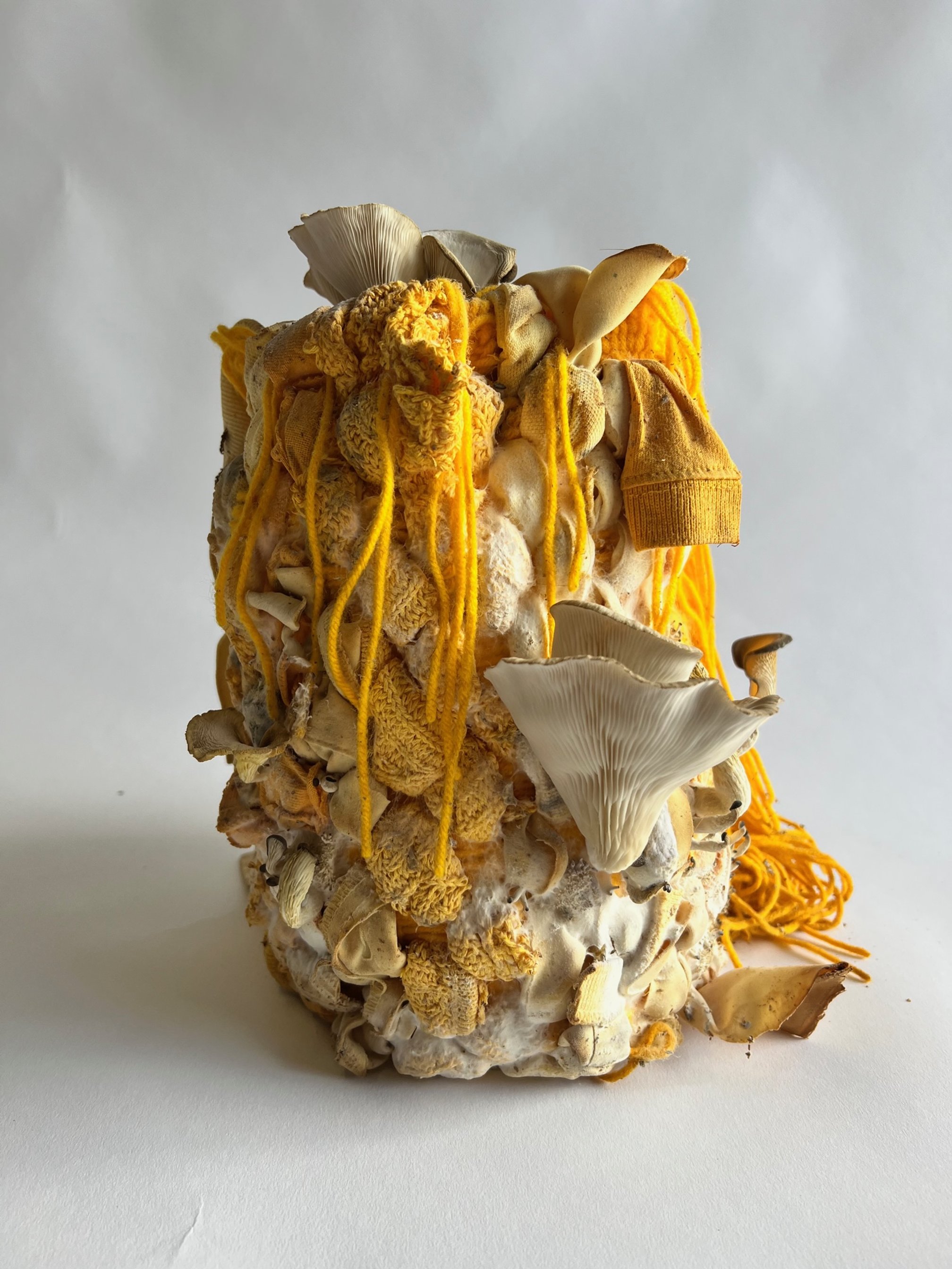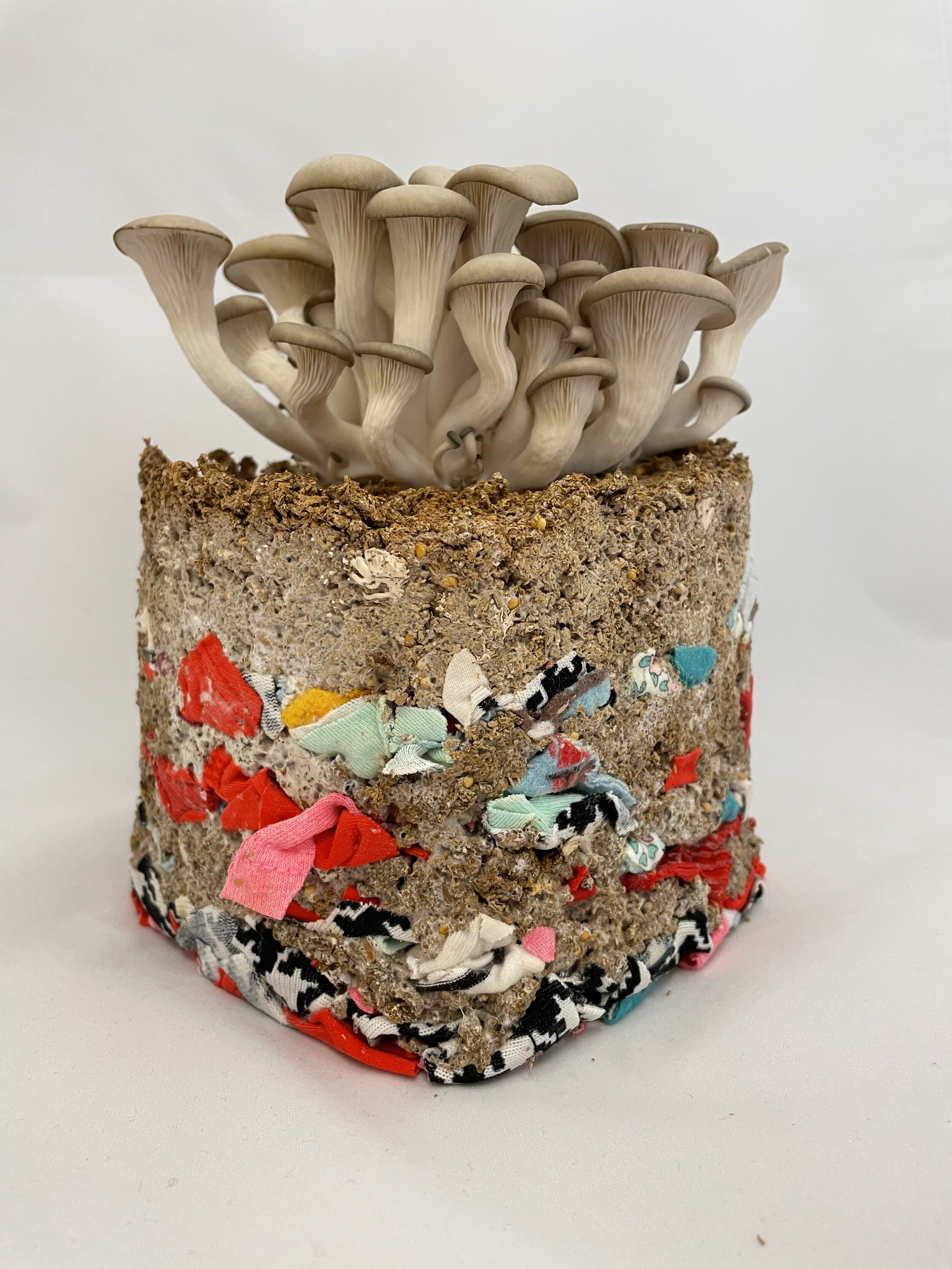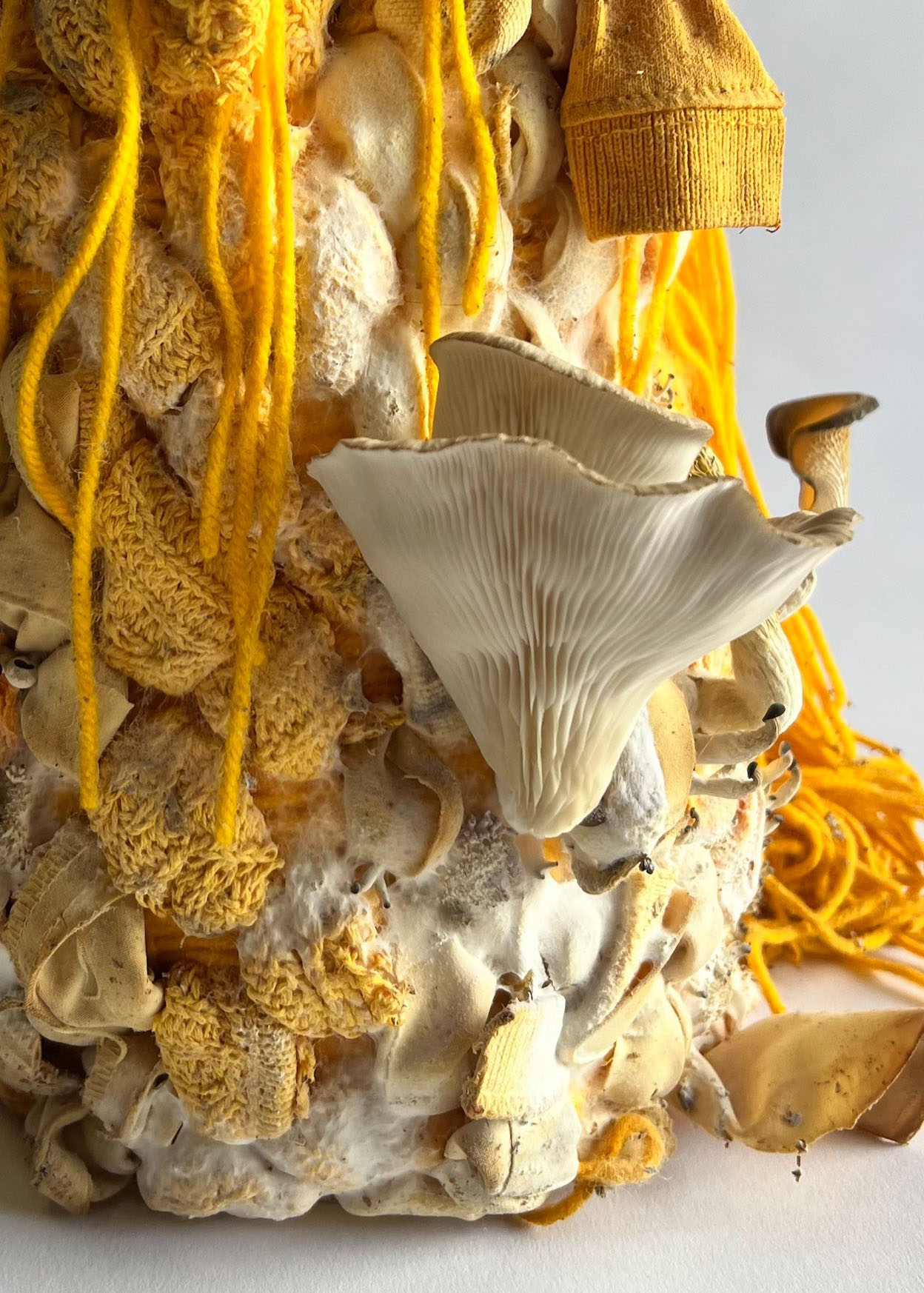 Once the mushrooms eat the textiles, the sculpture becomes regenerative soil. Her plan is to test the health of the sculpture's soil by using it to grow native plants. She wants to sample the mycelium and its mushrooms to see if any microplastics remain or if there are any toxins and minerals from the clothing the mushrooms can eat and remain healthy.