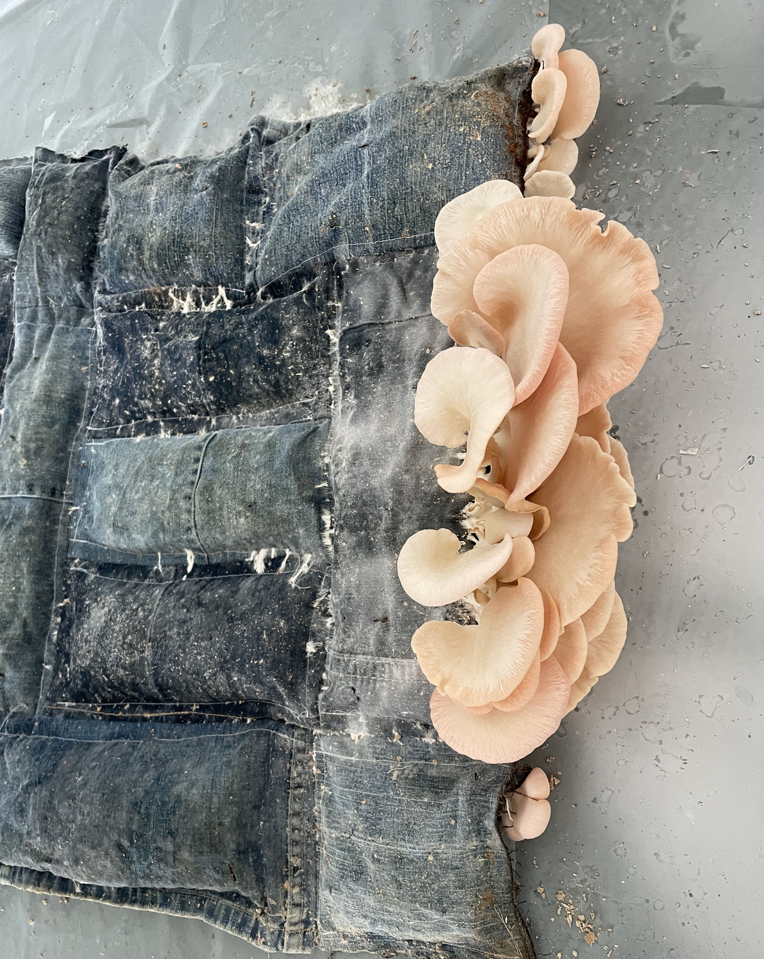 With the help of DIY Fungi founder and Ph.D. candidate Danielle Stevenston, Opazo began exploring the introduction of oyster mushrooms and textiles while at an artist's residency in Colorado. Over a Zoom session, Stevenson taught Opazo how to introduce mushrooms to textiles and let them grow. She started with denim.