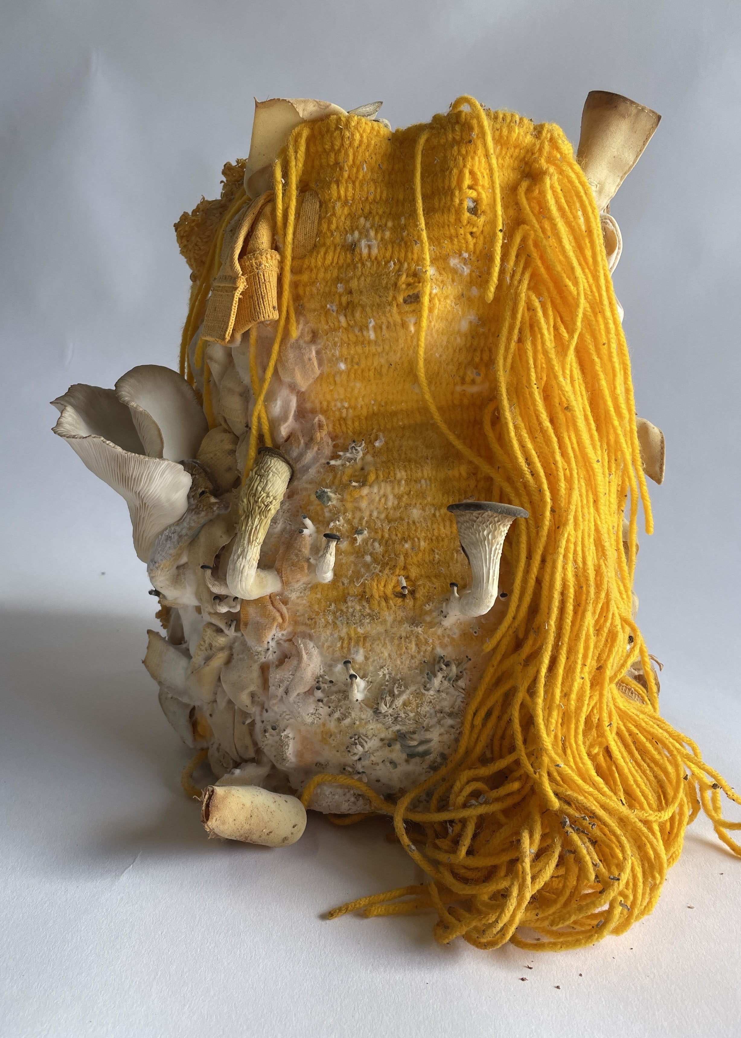 To make this sculpture, Opazo weaves recycled textiles on one of the looms in her studio. After creating a textile form, she'll introduce fungi to the sculpture. In a few weeks, clusters of mushrooms will fruit, fueled by the bits of old clothing that fungus can digest.