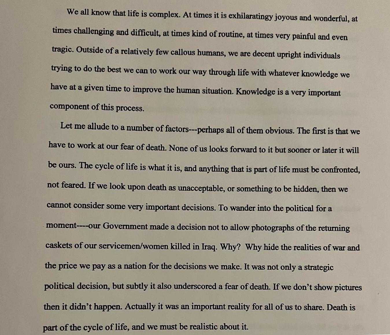 “I accept the reality that you’re not coming back to us as you were. But you are here with me every day. Our four wonderful children show me daily. You are indeed in spirit here with me. They are so full of kindness, caring, thoughtfulness and love since you departed. I see in them –- even if they stop for a short visit, or if they fly in to see me and spend a week or two –- that you are there in spirit. Man, you left them with so much of you inside, and they really take care of me in so many ways. And I know they have my back as you did. So I feel your presence in all of our children, and it gives me great comfort.”