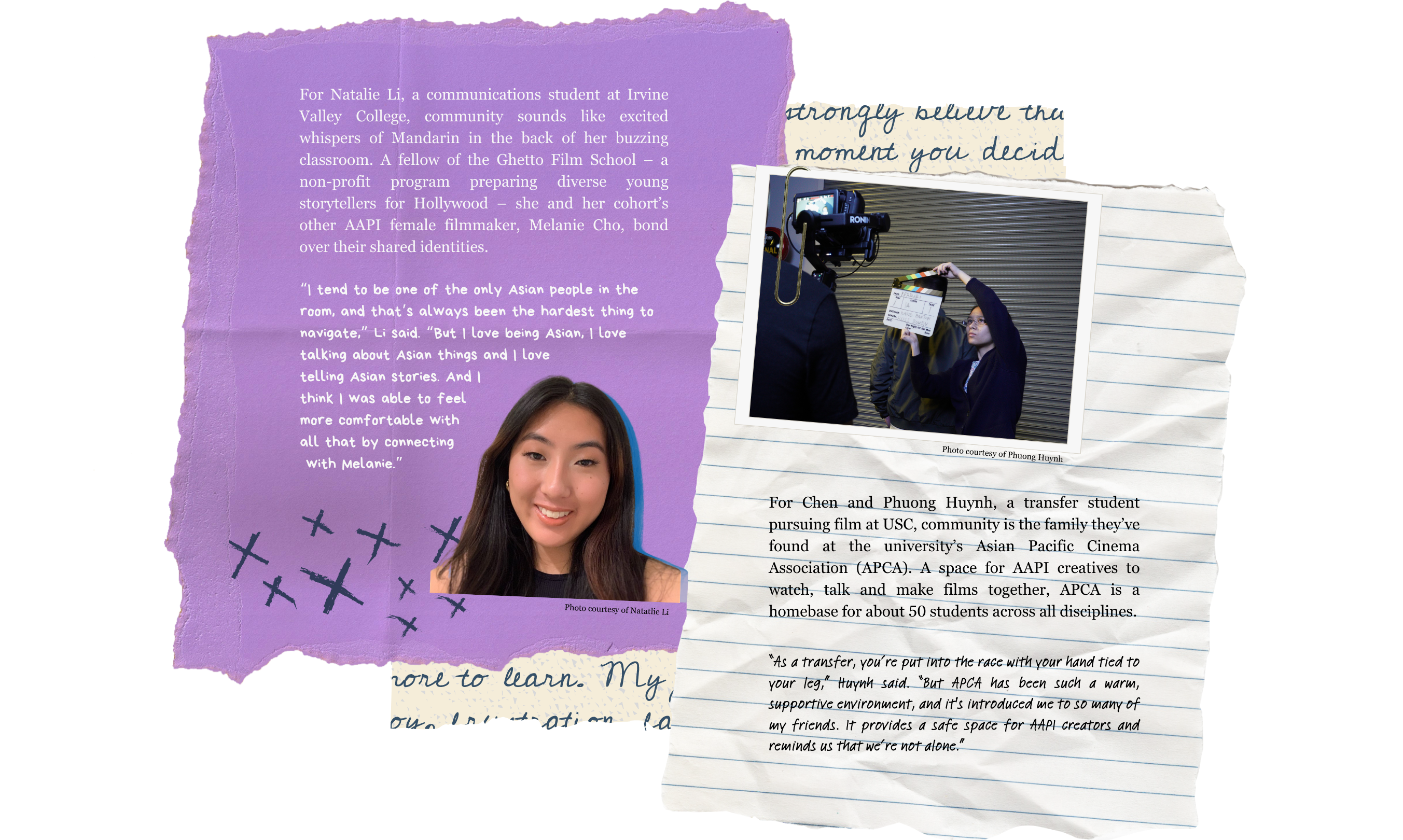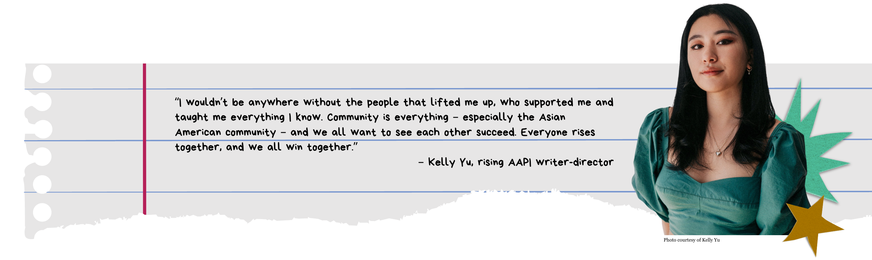 “Community is the talented people you want to work with, but it’s also that emotional support,” said Kelly Yu, a rising AAPI writer-director. “It's a really tough industry, full of self-doubt, insecurity and comparison. So having people in your corner who can be a great DP or a great first AD but who can also be there for you in times of need – that’s a really valuable thing.”