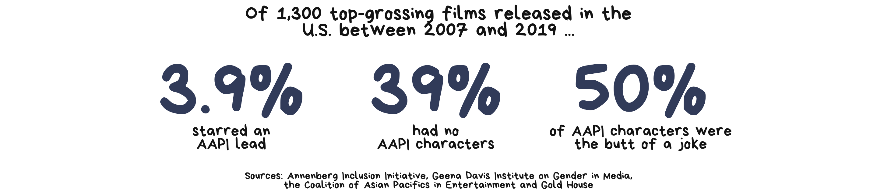 Oftentimes, this lack of representation in front of the camera can be linked with inequities behind it. In an analysis of the 1,300 top-grossing films released in the U.S. between 2007 and 2019, the Annenberg Inclusion Initiative found that only 48 boasted a director of Asian descent. Of these directors, only three were women.