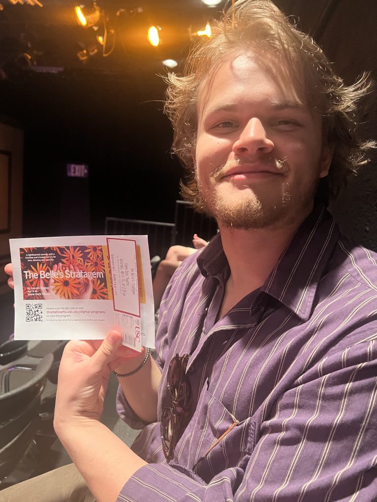 Corey Lee, one of Emma Woodward’s D&D party members, attending her performence in The Belle’s Stratagem Soon enough, the lights dim and Emma soon graces the stage in a towering white wig and pink puffy gown, very much befitting her flighty character. Lee and I watch, entranced as Emma adorably patters around the stage, as per her Miss Ogle characterization.