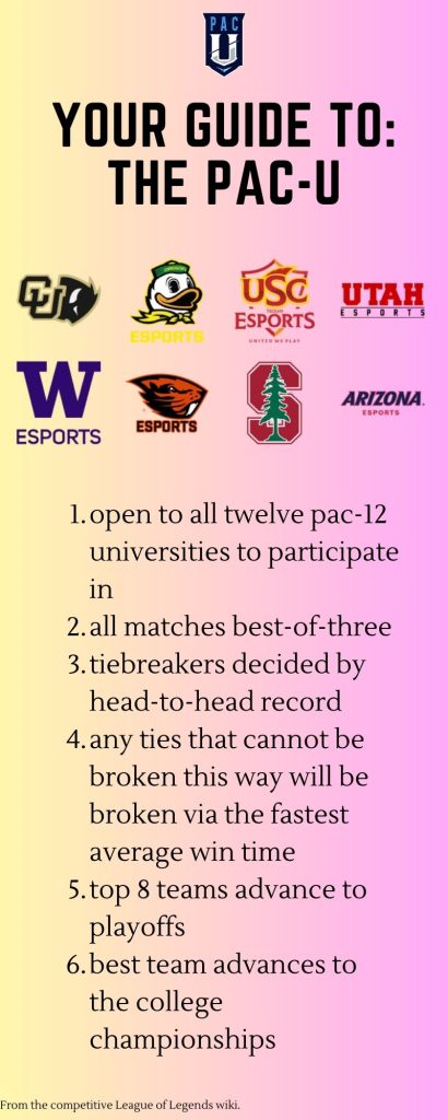 It’s here that USC’s eSports team, or USC eSports, lives and breathes in its quest to achieve dominance; similar to their regular sporting teams, USC eSports competes within their Pac-12 division. In League of Legends, the Pac-12 Conference is instead titled the Pac-U Gaming Conference, with each of the Pac-12 Conference universities having their own respective eSports team to take their place as the representative of that school.