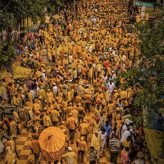 In the town of Jejuri, Mahrashtra, Lord Khandoba is celebrated three times a year in the Bhandara Festival. Lord Khandoba is beleived to be the descendant of the sun god, Surya, and is often depicted holding bowls of turmeric that symbolize sunlight. People show their respect for Khandoba by throwing turmeric around the city, the Khandoba temple, and bathing in the golden spice. Source: Pinterest