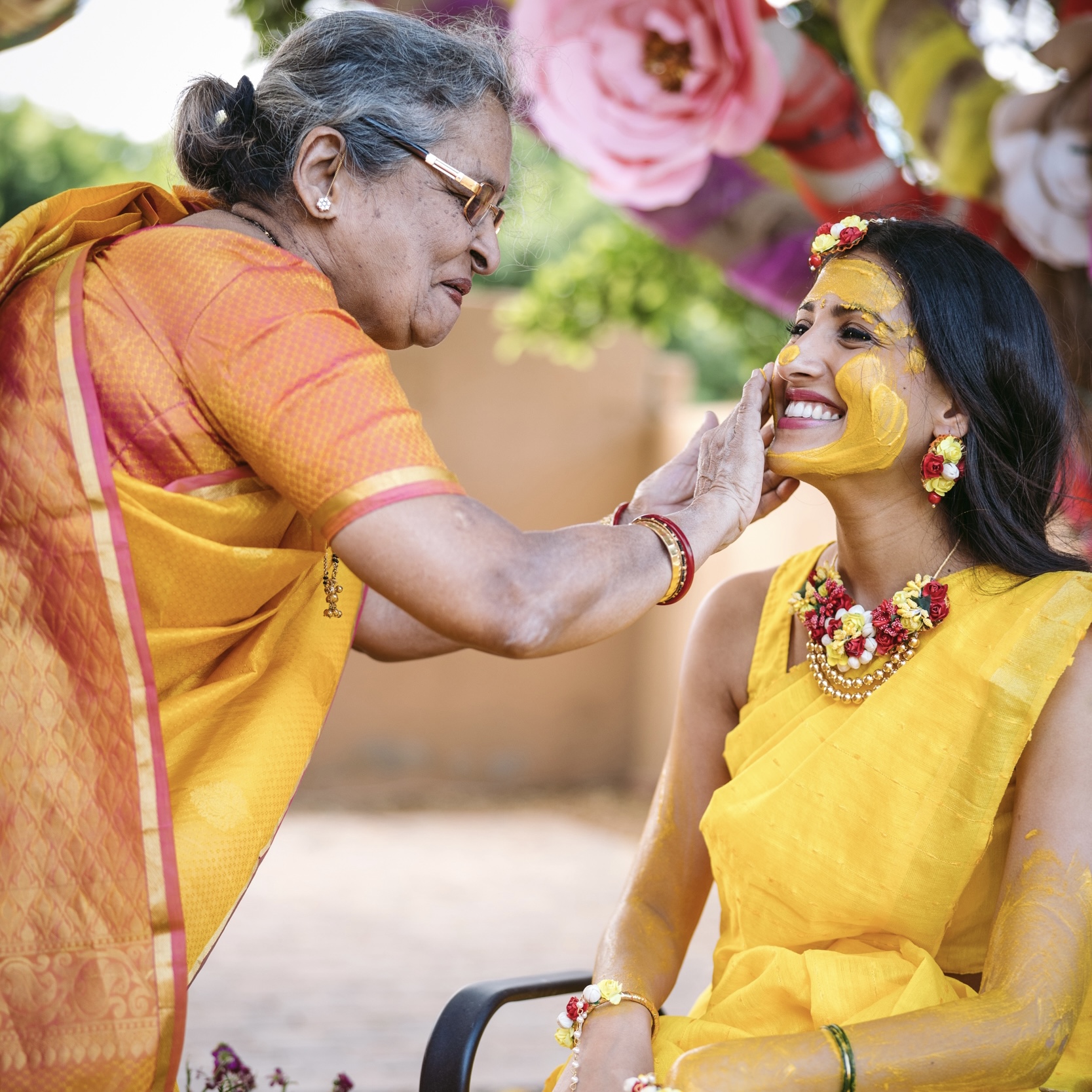 Haldi is a pre-wedding ceremony that involves a turmeric paste which covers the couple's faces, necks, hands and feet. Close family and friends apply the haldi paste onto the couple as a purifying ritual of the body before marriage. The paste is then removed in a ceremonial bath, preparing the couple for their marriage in the coming days. Haldi represents blessings of the marriage, along with clensing the body for this new chapter. Source: Salmada Photography
