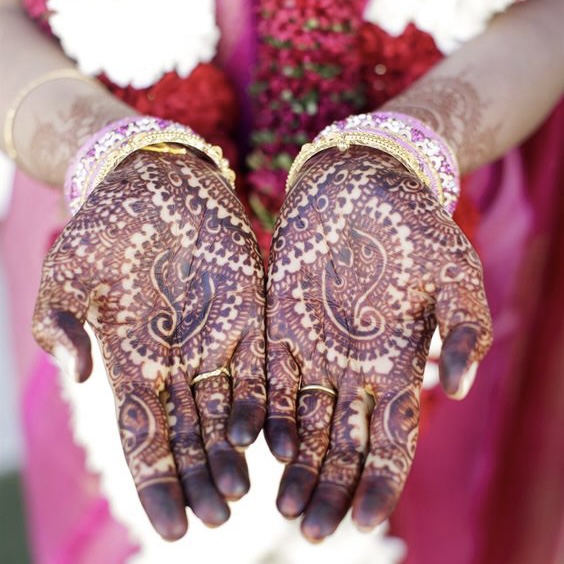 Henna has been an addition to celebrations like holidays, parties, or weddings in Desi culture. Henna pastes include turmeric, which help bring a more lighter and yellow tone to henna. Henna is applied to the neck, hands, feet in eleborate designs that are closely tied to the Hindu faith. Many also use henna paste throughout their hair as a temporary dye, bring health and shine to ones hair, and inculde in wedding festivities. Source: Pinterest