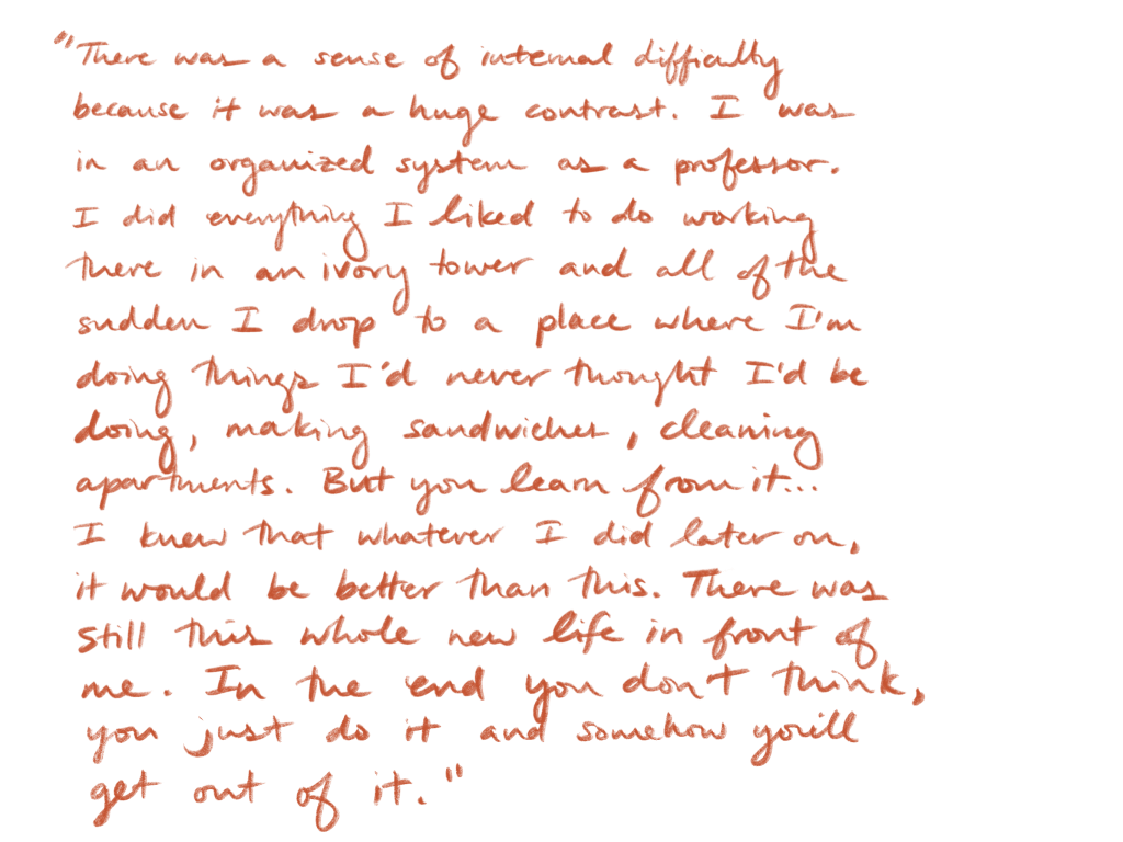 “The biggest thing that was on our minds was, ‘We have to support our lives.’ We stayed at friends’ homes. Your dad needed a studio. How were we going to live? We made a total of $1000 a month – $500 for rent and $500 for food. That couldn’t sustain us.”