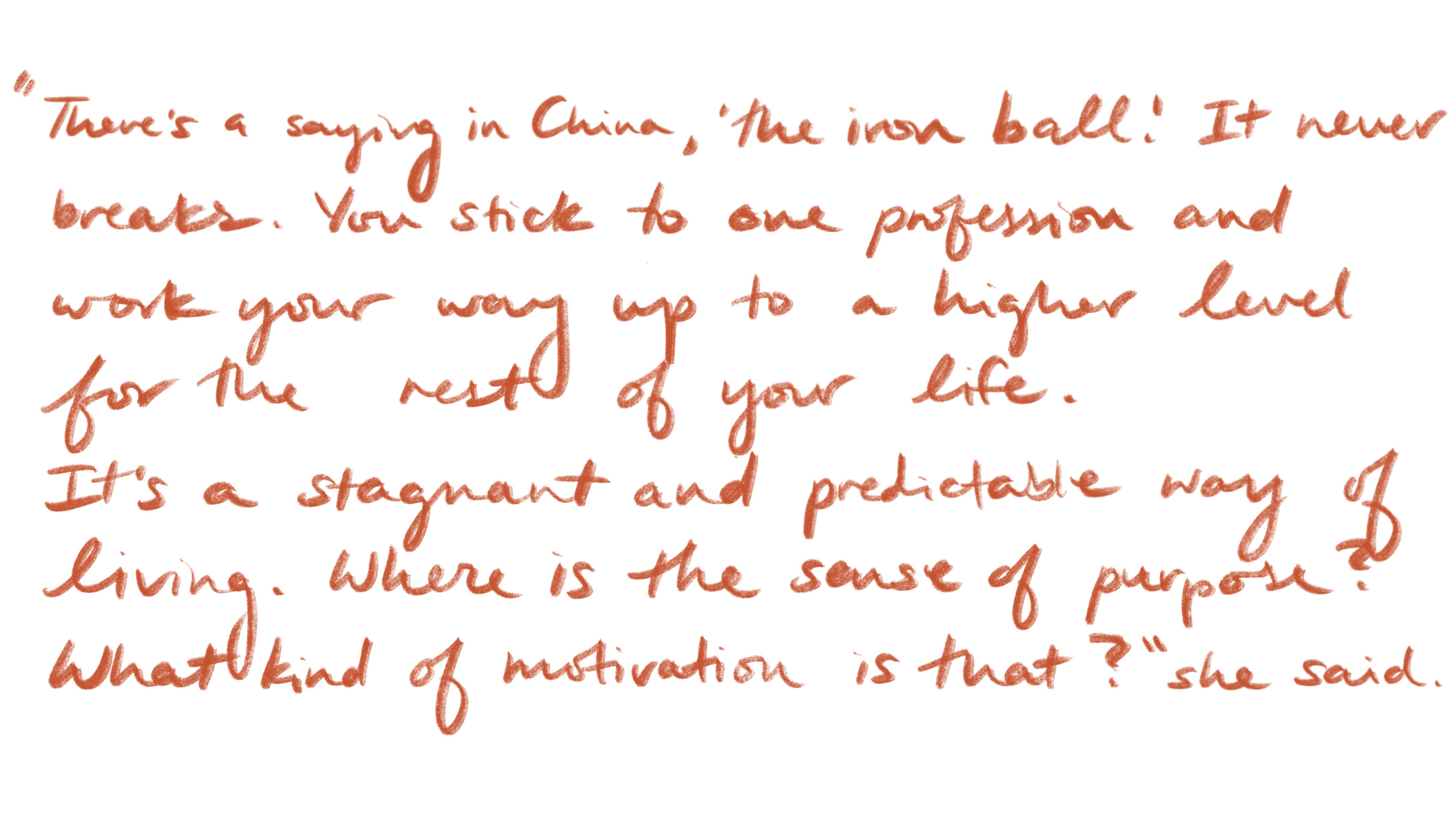 “Your grandparents went through the cultural revolution. That was a really scary time. Lots of people died. We were just scared another cultural revolution was going to start. Our parents didn’t want us to go through what they had gone through and we didn’t want our future children to grow up in that kind of an environment, so your father claimed this opportunity at SFAI and we agreed to leave China.”