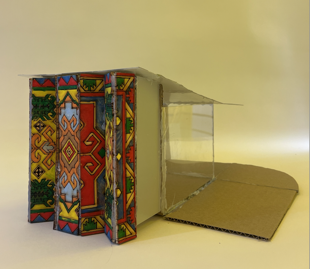 Her model below, “Հայաստանի Գիտահեղուկի Կենտրոն” translates to “Armenian Knowledge Center” and is an Armenian internet cafe, that seemingly integrates indoor and outdoor spaces. The café’s architecture includes floor-to-ceiling windows and a wall comprising the intricate designs of two traditional Armenian carpets.