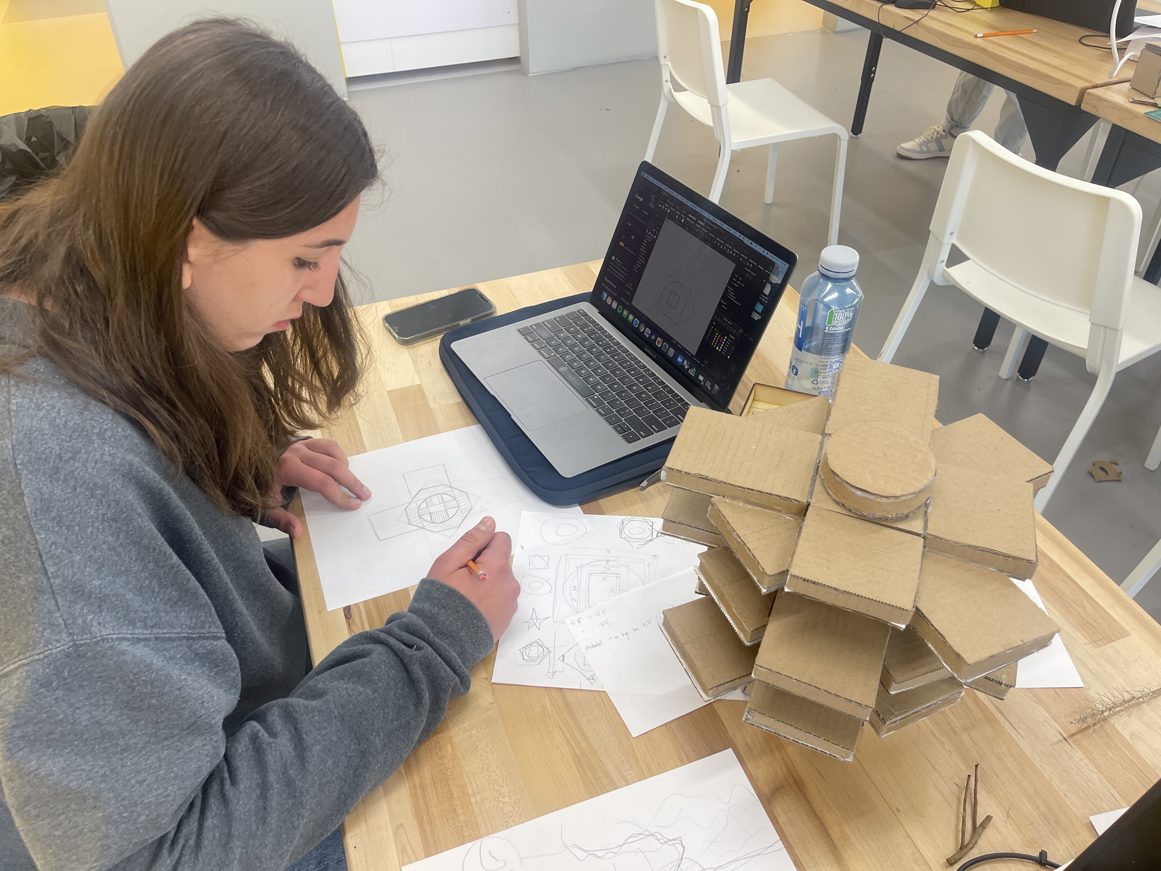 Students collaborate and sketch new product designs in their multimedia art course.