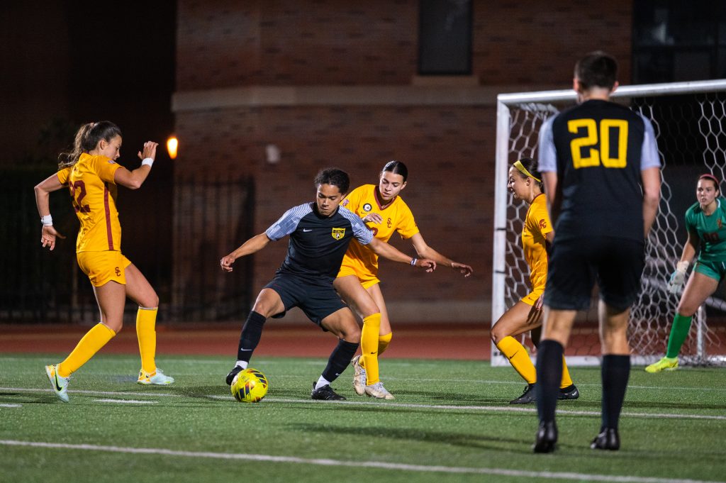 USC men’s soccer player Zach Hasksins fights to maintain possession during a scrimmage with the women’s Division I team.