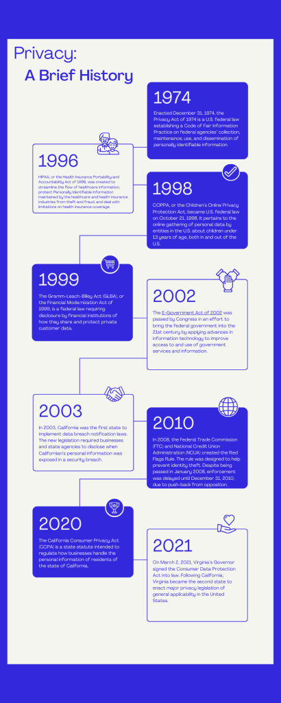 On the federal level, back in 2021, Congress introduced the Social Media Privacy Protection and Consumer Rights Act of 2021. Essentially requiring “online platform operators to inform a user, prior to a user creating an account or otherwise using the platform, that the user’s personal data produced during online behavior will be collected and used by the operator and third parties. The operator must provide a user the option to specify privacy preferences, and an operator may deny certain services or complete access to a user if the user’s privacy elections create inoperability in the platform” (S.1667 – Social Media Privacy Protection and Consumer Rights Act of 2021).