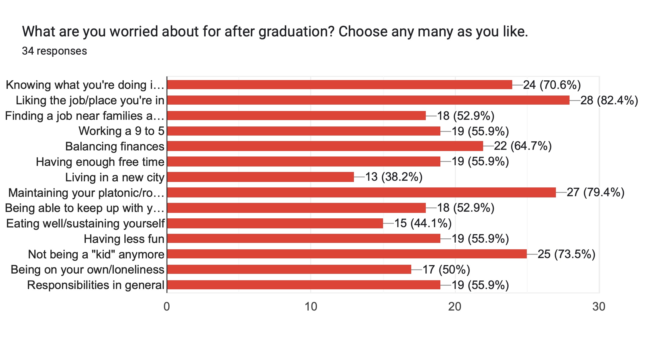 Based on a survey I sent out to my fellow college seniors, over half said that it would benefit them to hear from other college seniors with their same worries. Out of a list of options, 82.4% said they are most worried about liking the job/place they are in after graduation, followed by 79.4% worried about maintaining their platonic/romantic relationships, and 73.5% worried about not being a “kid” anymore. There were many write-in responses revealing even more concerns–balancing finances, having enough free time, and just dealing with responsibilities in general. What I concluded was this–we’re worried. About everything. And we don’t really talk about it. I’m hoping this guide will be a resource for those who feel lost and anxious about life after professors and textbooks.You Are Not Alone.