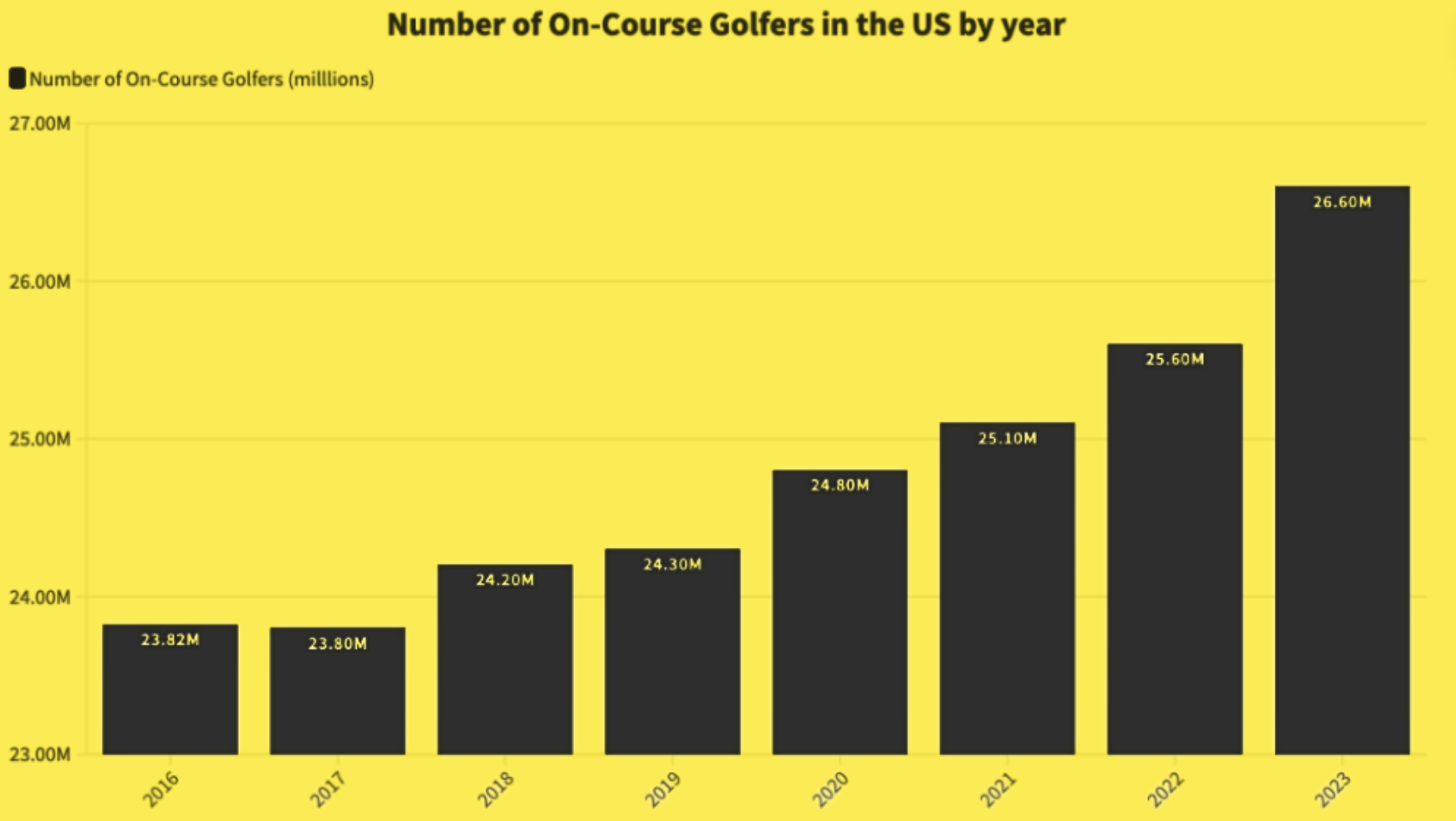 Since COVID, the golf industry has seen record breaking growth that is beginning to rival the "Tiger Effect" surge ignited by Tiger Woods bursting onto the scene with his first Masters win in 1997. As Tiger continued to dominate over the next ten years, the golfing population in the U.S. shot up to 29.8 million in 2007, a 22% increase. However, by 2012 the number had plummeted below 23 million and had remained relatively stagnant until recently.