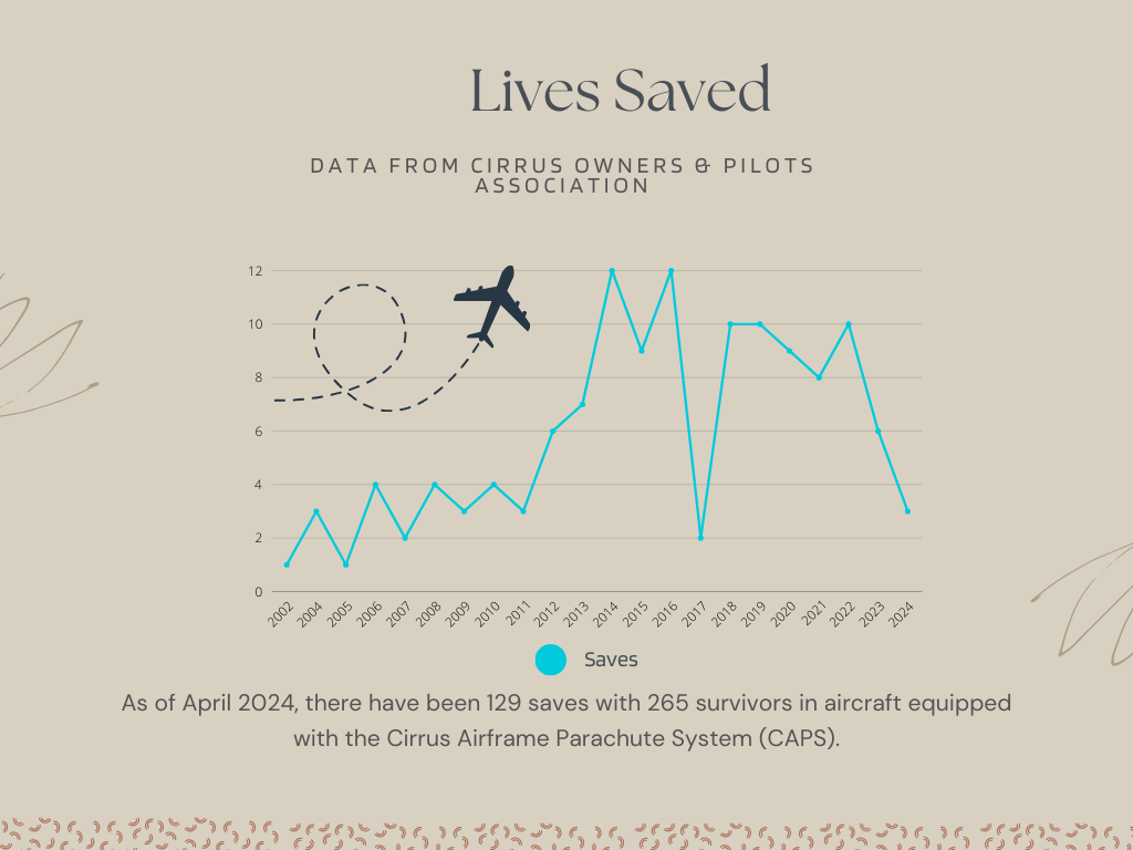 Throughout the world, the Cirrus Airframe Parachute System, or CAPS, has – as of April 2024 – opened 152 times, saving 265 lives. In November of 2018, Donaldson became save No. 81.