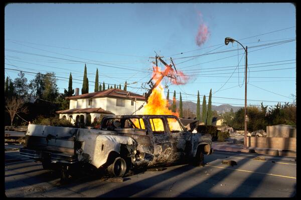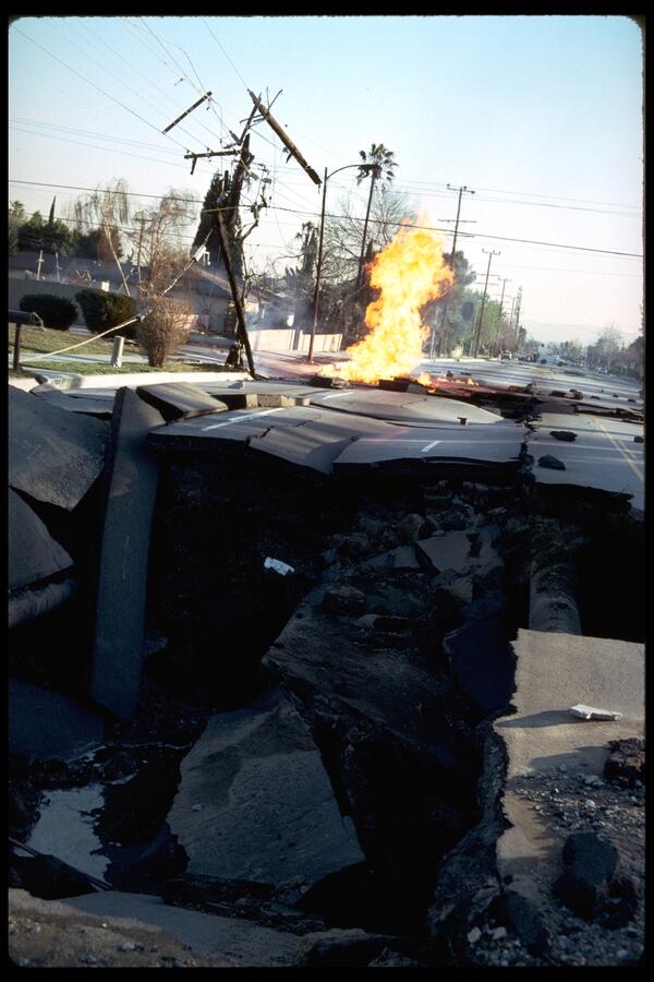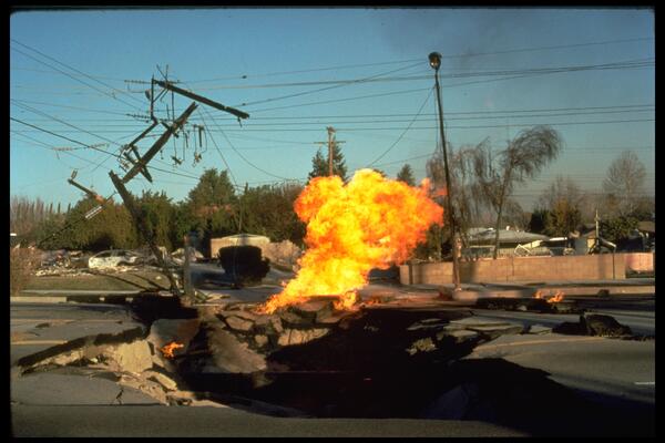 LEFT: A fire breaks out after the Northridge Earthquake. Image courtesy of USGS. Public Domain.