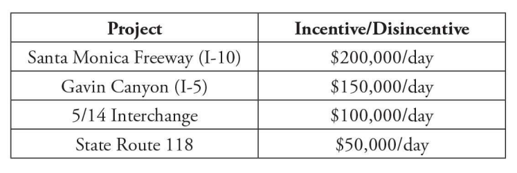 A recent use of the contracting model is when the 10 Freeway in Downtown Los Angeles was damaged by a massive fire that began under the Alameda Street overpass in November 2023. Work on repairs began almost immediately after the fire was extinguished and, in collaboration with Caltrans, the contractor was able to finish the job in record time. The freeway was damaged on November 11; it was repaired and reopened in eight days.
