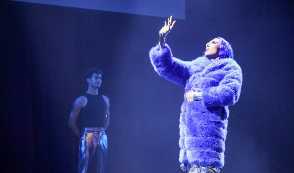 Flipping her waist-length blue hair, revealing her intense cat eye to the audience, the clacking of Rae Oblivion’s knee-high stiletto boots could be heard from the back of the Bovard Auditorium at USC. With flashes of blue strobe lights, Kim Petras’ “Claws,” sounded, immediately inciting “woos” and “slays” from the crowd.