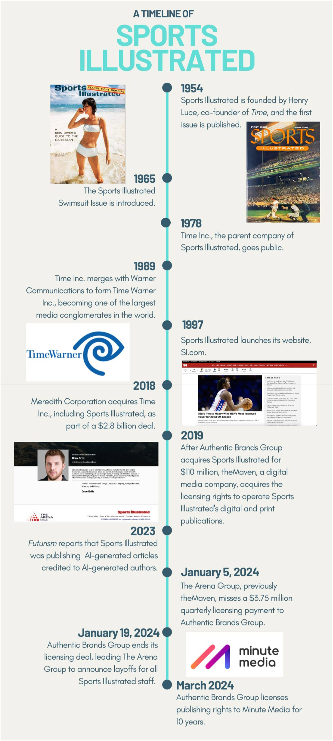 Once a beacon of insightful sports journalism and captivating storytelling, Sports Illustrated, credited for ushering in numerous aspiring writers like Skiver into the field of sports journalism, found itself at a crossroads. On January 19, 2024, the magazine saw mass layoffs across its editorial team after its parent company, Arena Group, failed to make a $3.75 million quarterly licensing payment to Authentic Brands Group. With an uncertain future casting a shadow over the magazine’s once-illustrious legacy, this decline stood in stark contrast to its decades-long cultural impact and historical significance.