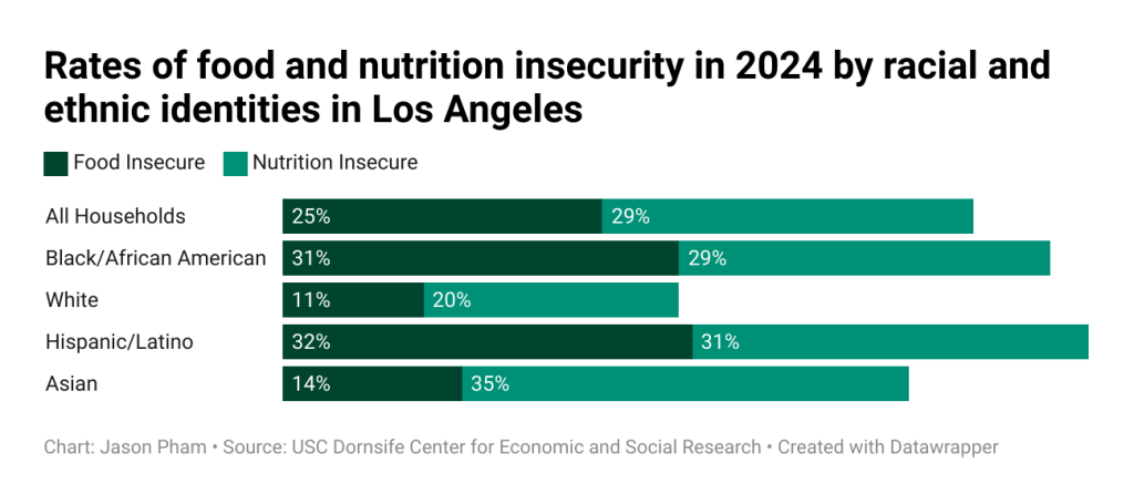 According to USC Dornsife, food insecurity levels spiked to a whopping 44% in 2023 and mellowed out to 41% in 2024, one of the highest rates recorded since food insecurity started being tracked during the Great Recession.