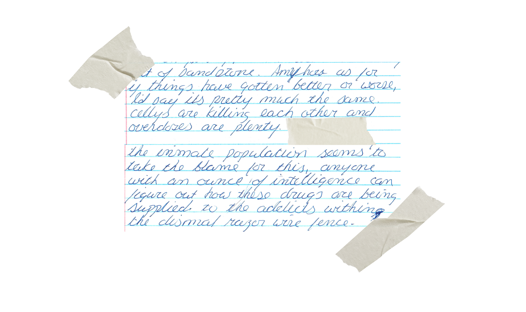 “Cellys are killing each other and overdoses are plenty,” he wrote in a March letter. “Although the inmate population seems to take the blame for this, anyone with an ounce of intelligence can figure out how these drugs are being supplied to the addicts within the dismal razor wire fence.”