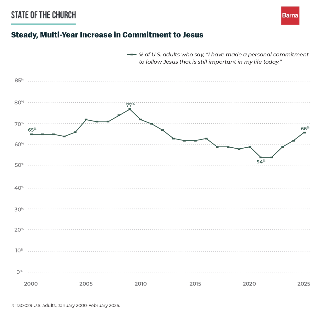 A recent study done by Barna shows a steady, year-over-year increase in commitment levels to Jesus, a shift that’s statistically significant enough that Barna posits it “may be the clearest indication of meaningful spiritual renewal in the United States.” Commitment levels—meaning a personal decision an individual has made that is still important and relevant in their life today—were at their lowest in three decades in 2021. In 2025, however, those numbers have raised a total of 12-percentage-points, up to 66%. While previously the charge in commitment has been led by older generations—Boomers and Elders—Millenials and Gen Z have shown significant increases. The numbers show that general curiosity about Jesus is on the rise, but why is that so, and why now?