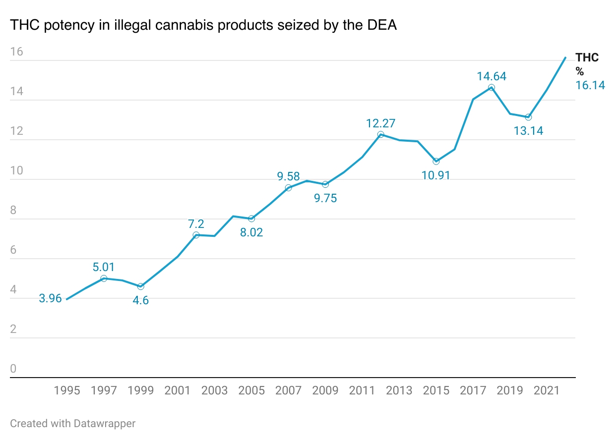 Between 1995 and 2022 the THC potency in illegal cannabis products seized by law enforcement quadrupled from 3.96% to 16.14%, according to the National Institute on Drug Abuse. Today, dispensaries can carry cannabis that has THC concentrations of more than 40%.