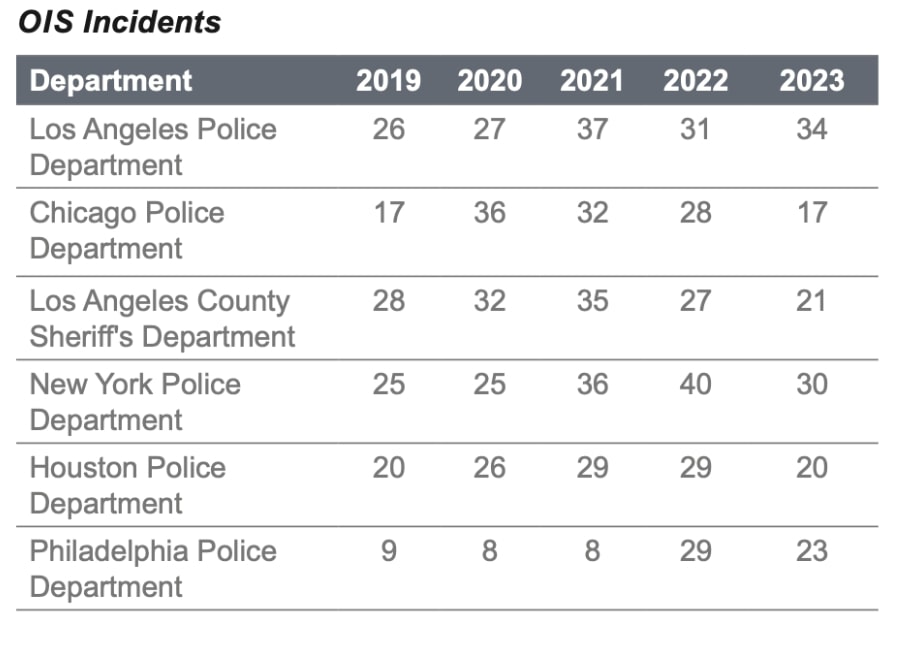 In its “Use of Force Year-End Review,” the LAPD reported 34 shootings by officers in 2023. Twenty-nine of these were people who were hit, five were people who were not hit. Seventeen of them died.