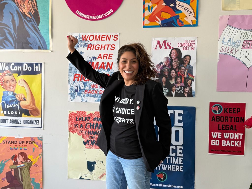 Emiliana Guereca standing in the Women’s March Foundation’s Boyle Heights office holding up a raised fist in a show of resistance and solidarity (Sarah Arencibia/Annenberg Media).