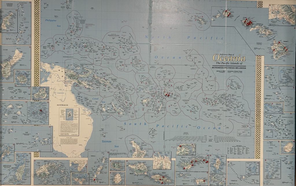 Most maps taught in American classrooms, like the one above, slices Oceania down right in the middle. Scratching only the surface and scattering its islands across the margins and reducing them to tiny dots in a vast blue nothingness.