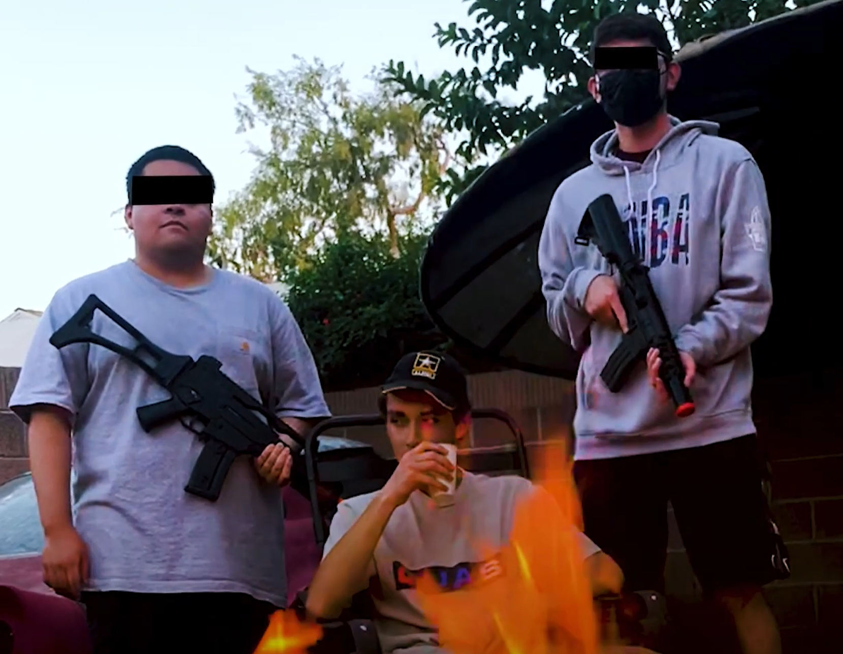 Guillermo sits in front of a fire, flanked by two friends holding fake guns, on Oct. 15, 2021. (The Reclaim Project/Dane Sprague)