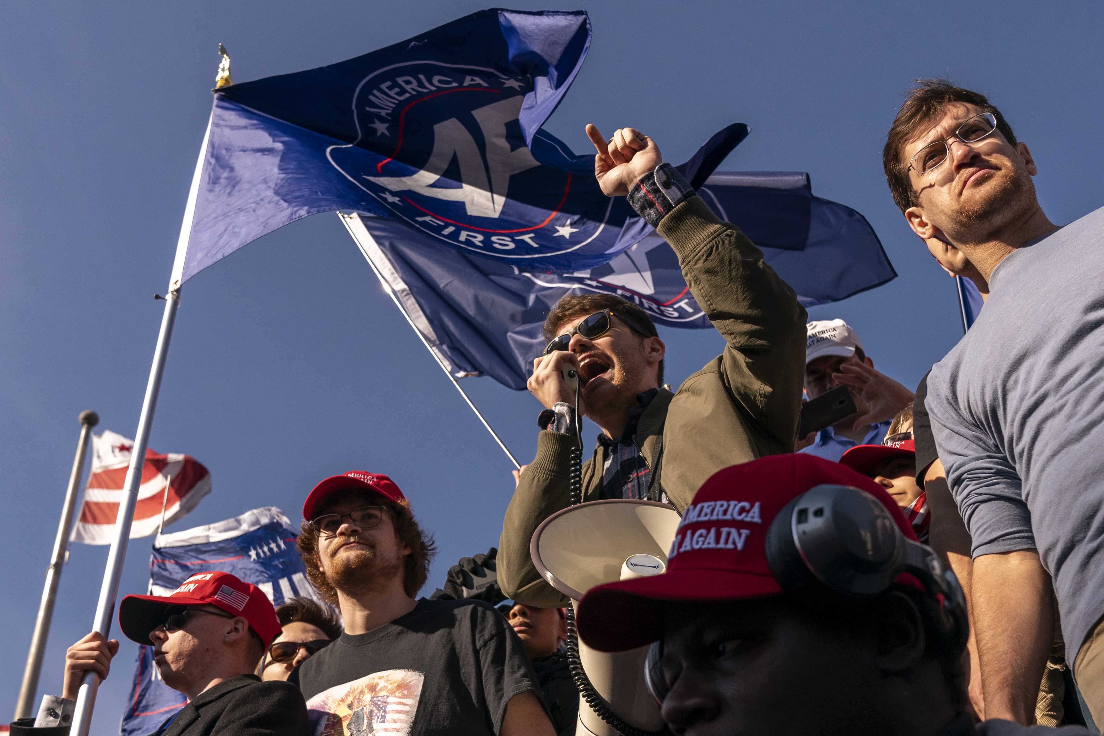 Fuentes speaks in front of flags that say, “America First,” at a pro-Trump march in 2020. (AP Photo/Jacquelyn Martin, File)