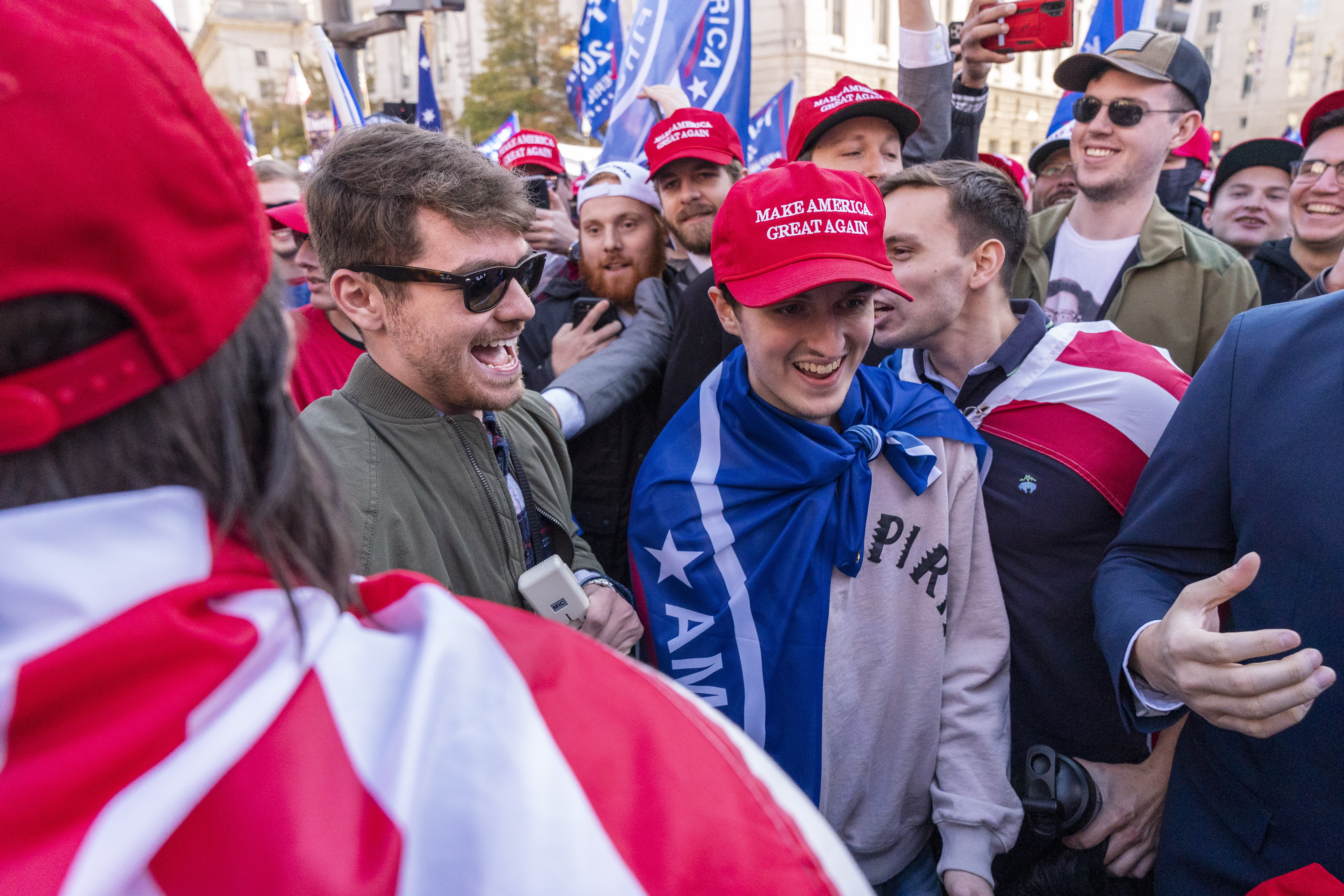 Nick Fuentes, a right-wing podcaster, center left, greets supporters before speaking at a pro-Trump march in Washington on Nov. 14, 2020. (AP Photo/Jacquelyn Martin, File)