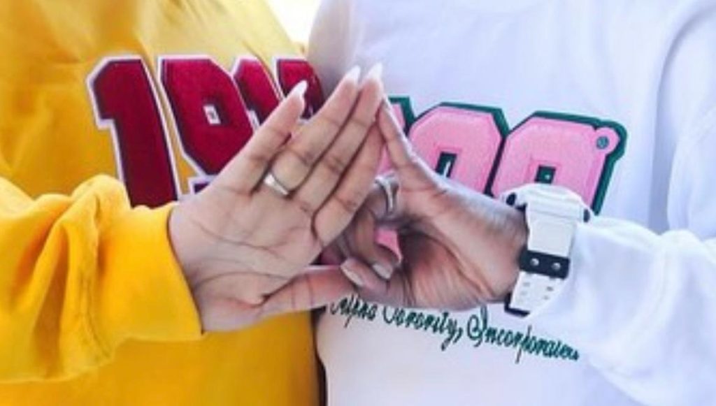 This is a screenshot of a woman who is a part of Alpha Kappa Alpha and a woman who is a part of Delta Sigma Theta joining hand signs. Each Divine 9 organization has their own hand sign, and normally split their hand sign (as shown above) when taking pictures with someone of another organization. The above hand is a picture of a couple where the women are in different organizations. (Photo courtesy of @recognizeourpride on Instagram)