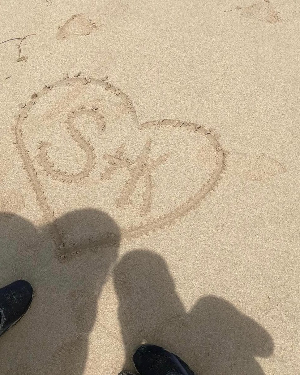 Shay and Kiki’s silhouette overlook their initials in sand.