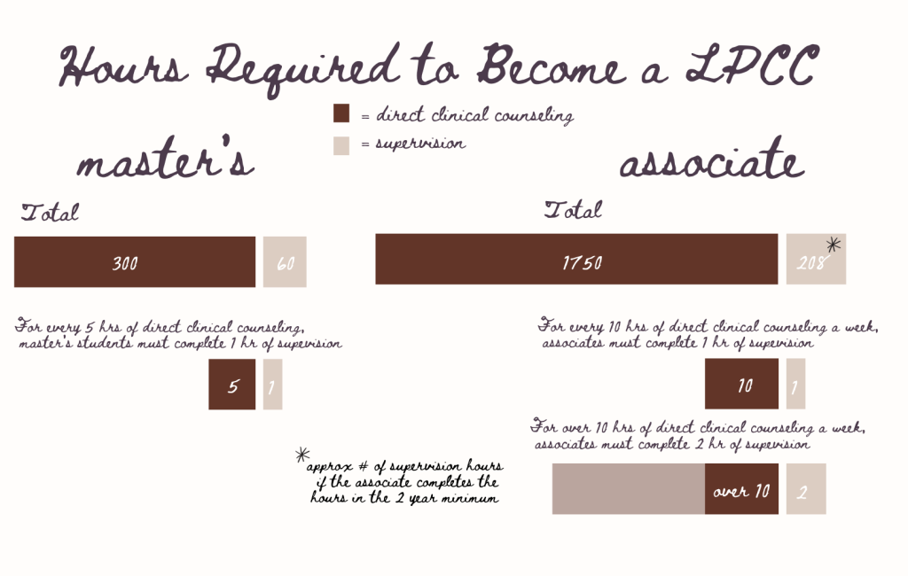 To become a licensed therapist or LPCC, therapists must complete a two-to-three-year-long MMFT or MMHC master’s program. After their master’s, students will become an associate or APCC for a minimum of two years and up to six years. During both the master’s and associate roles, trainees will complete directing counseling hours with patients and supervisions.