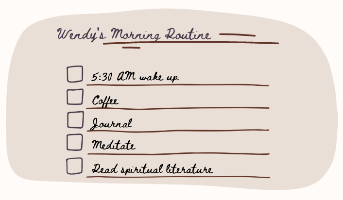 For Wendy, there is not much time between sessions to implement this practice. Now, she unwinds by swimming in the ocean with her friends, going for a walk, or experiencing nature. To prepare for the day ahead, Wendy has developed a morning ritual at the recommendation of several friends.