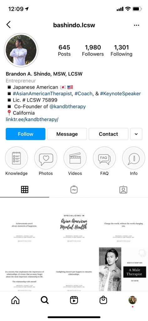He follows standard Instagram practice that focuses on aesthetics: having a theme throughout his colors, visuals and frequent posts, and utilizing the many features the app offers like feed posts, hashtags in captions to increase engagement, stories that survive for a 24-hour period and allow for aggregation and reposting from other accounts, highlights on the homepage where stories can be categorized and live forever, and IGTVs which allow for longer form video and live streaming. These long-form videos involve Shindo in front of the camera where he speaks about his own journey, what private practice entails, finding a therapist, and relatable anecdotes with thematic messages of self-help. His feed is filled with self-quotes, quotes by others he finds personally inspiring, and information on how to further connect with him for a real session of teletherapy.